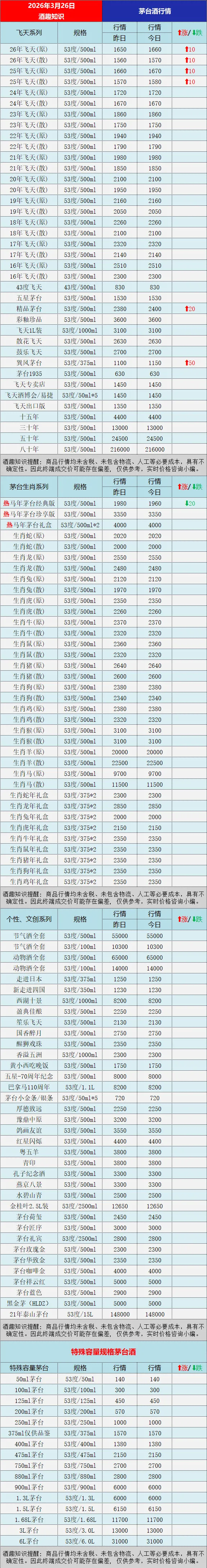 今日茅台酒行情价格参考:飞天系列,2025-2026年飞天原箱、散瓶上涨,精品茅台、巽风茅台同步显著上涨;生肖系列,马茅经典版下跌。更多茅台系列酒具体行情参考下文图表:《酒趣知识》温馨提醒:商品信息均未含税、未包含物流、人工等必要成本,具有不确定性。因此终端成交价可能存在偏差, 仅供参考,实时价格咨询小编。注意:茅台等品牌老酒价格小幅波动频繁,老酒受品相克重影响价格差异大,同时不同地区价格有几十元不等的差价,最终以实际成交价格为准!《酒趣知识》多媒体平台同步给您带来茅台酒及时行情参考,同步深挖茅台、五粮液、汾酒等各大名酒资讯,为酒友奉上客观的价格参考与专业的行业解读,让大家用酒有价可依、避坑无忧。丨声明:部分图文来源于网络,版权归原作者所有,如涉及版权等问题,请及时与小编联系删除或修改。