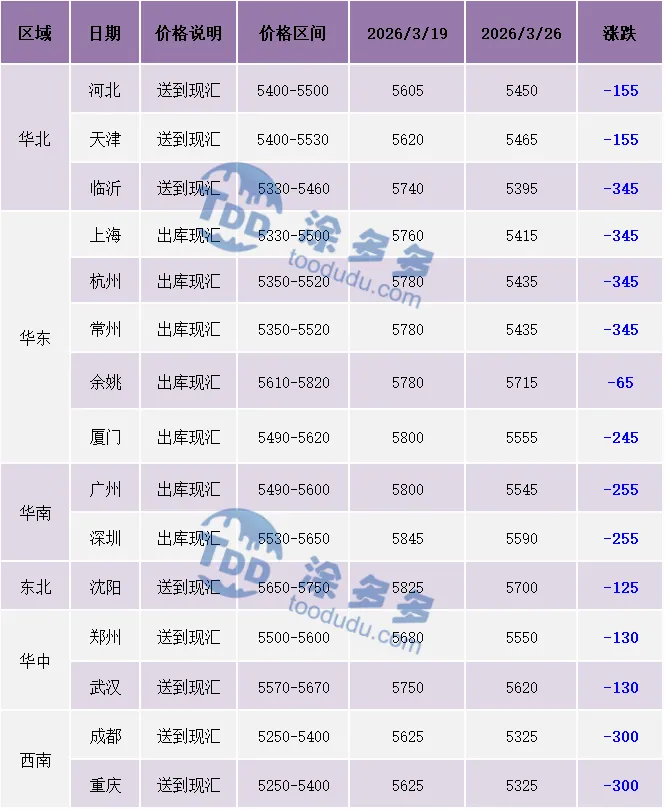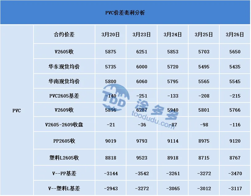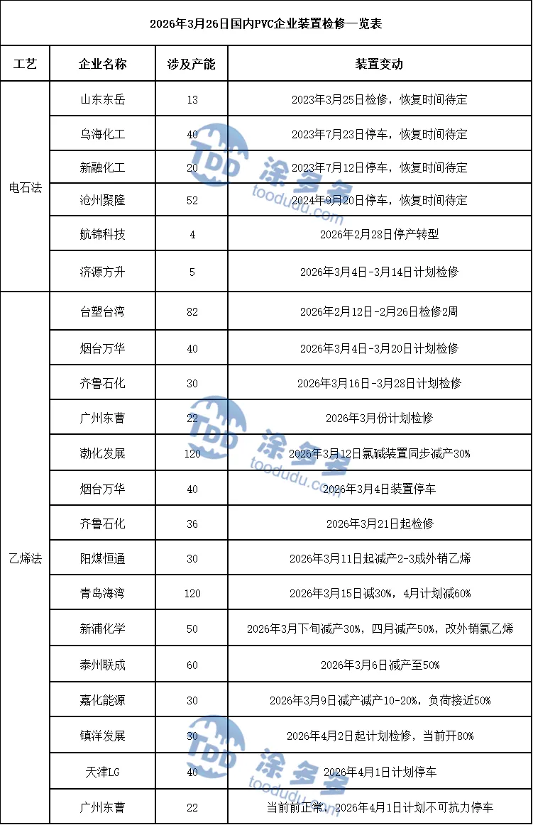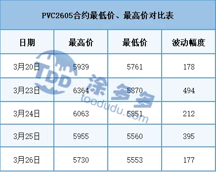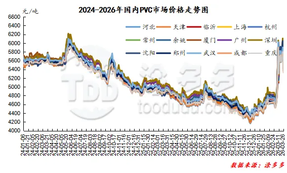 本周(2026.3.19-2026.3.26) 周内现货市场价格综合对比呈现下跌的趋势,周一出现期货出现最高点6364,相应的现货报盘也出现大幅暴涨的局面,但行情出现最高点后迅速下跌,风险度攀升。周内的影响因素:1、期货盘面期价的运行周一出现大幅上涨高点6364甚至逼近涨停点,但周二至周三两天时间大幅下跌,周四低点5553对比高点价差811,期货交易的风险度骤增,行情突变。2、供应方面来看,从装置变化的情况可以看到,乙烯法方面开工率下调,未来时段基本存在降低负荷的预期,但电石法方面开工率提升,近期不断上涨的行情使得PVC单品出现利润,提振了电石法企业的开工积极性,电石法的检修计划呗推迟。3、需求方面来看,PVC下游刚需未见较大的变化,但价格的宽幅调整仍令中间商活跃,高位价格抑制需求,在周三价格下跌后,现货市场成交增多。4、成本方面,周内原油以及单体价格小幅下跌,电石方面上涨100-200元/吨。5、周内中东战事开始在缓解和紧张中来回切换,造成国内商品宽幅调整。整体来看期现两市周内先大涨后大跌。从估价对比来看,其中华北地区下跌155元/吨,华东地区下跌345元/吨,华南地区下跌255元/吨,东北地区下跌125元/吨,华中地区下跌130元/吨,西南地区下跌300元/吨。中国台湾台塑PVC出口3月份船货离岸价环比2月上调40美元/吨,台湾FOB报650美金,中国大陆CFR到岸价720美金,印度CFR到岸价720美金,东南亚CFR到岸价715美金。
