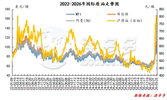 截止到3月25日,WTI价格为90.32美元/桶,较上周同期下跌6.0美元;布伦特价格为102.22美元/桶,较上周同期下跌5.16美元,阿曼(期)价格为109.55元/桶,较上周同期下跌43.57美元,沪原油727.2元/桶,较上周同期下跌24.0元/桶。