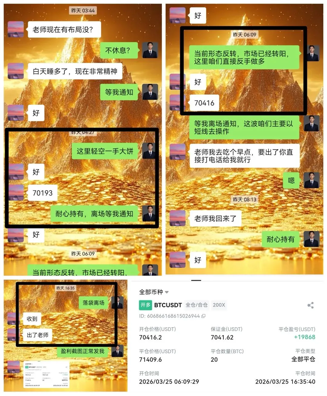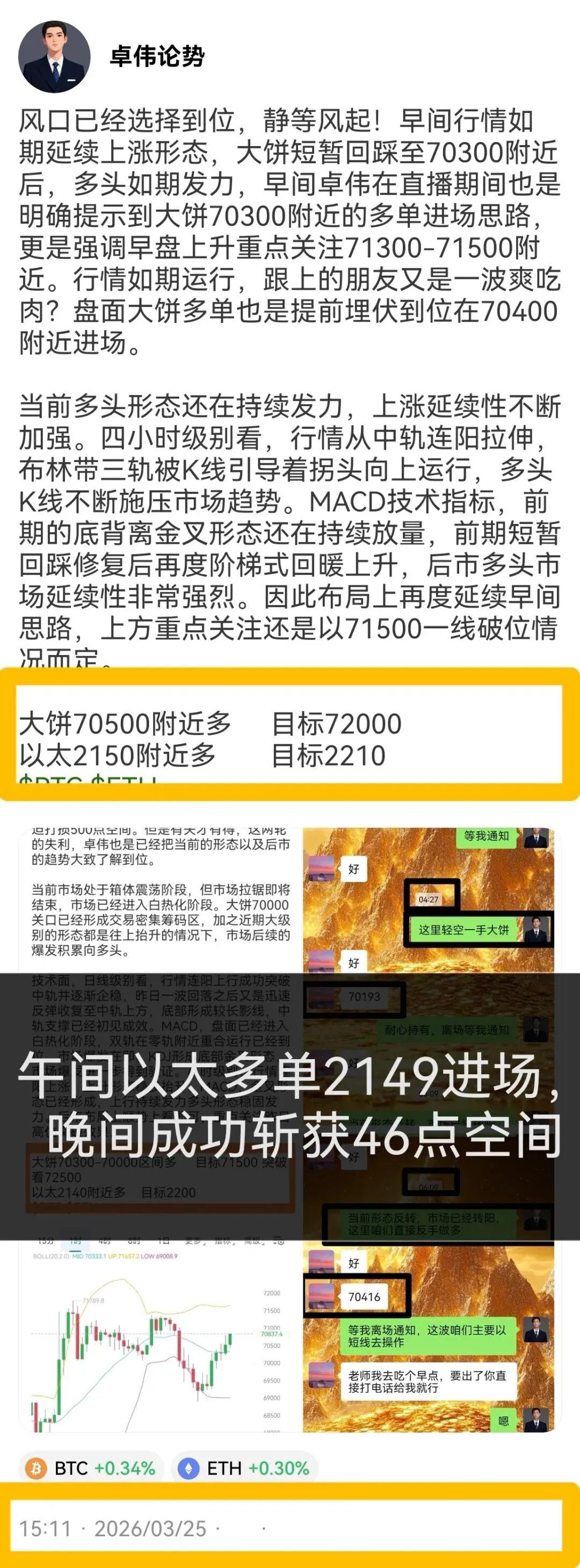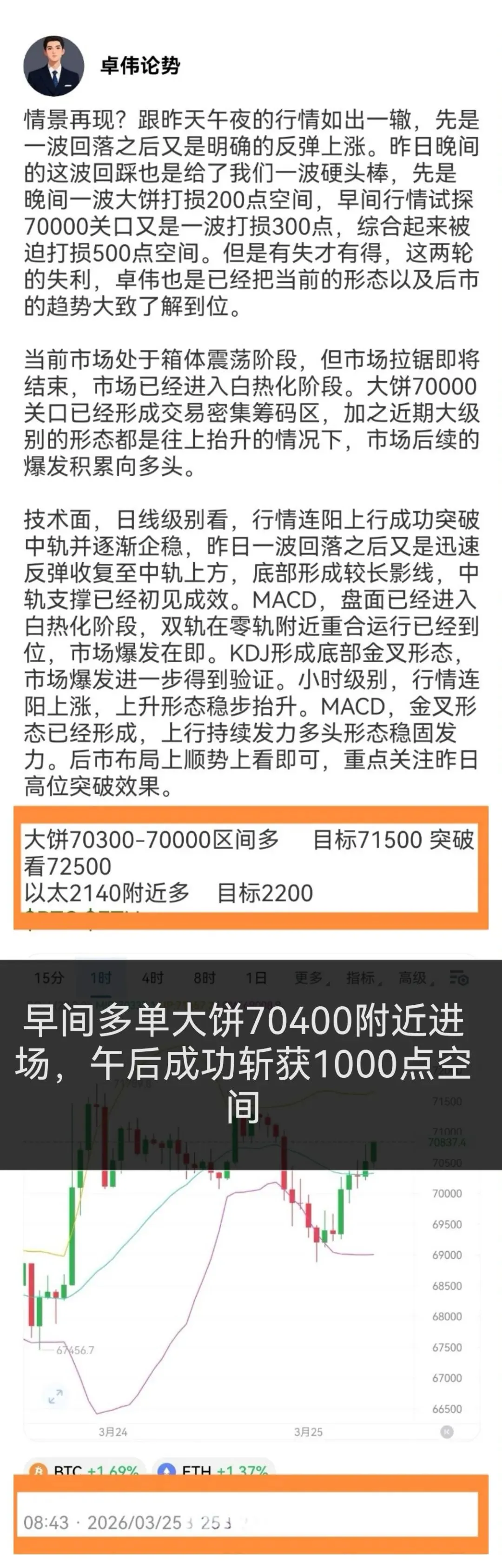 盘中今日稍有懈怠,仅布局两轮三战两胜,午夜阶段大饼空单打损200点空间后就是反手做多在70400进场成功斩获1000点空间,以太午间多单2149进场成功斩获46点空间。
