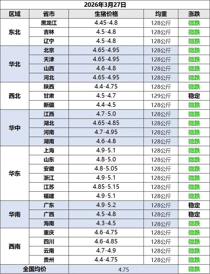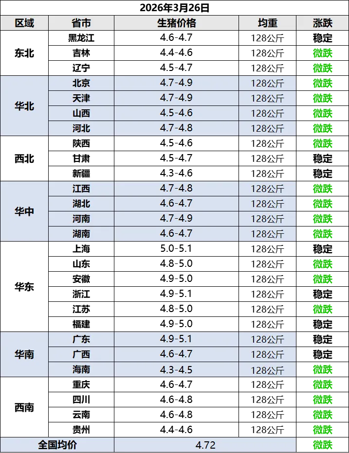 根据统计的猪价,算出2026年3月26日全国平均猪价为每斤4.72元,比昨天下跌0.04元,跌幅为0.73%,跌幅小幅收窄,连续7天下跌,累计下跌0.28元,不仅继续创下今年以来最低,也继续创下至少是2019年以来的新低。