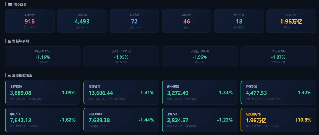 2026年3月26日,隔夜美股(2026.03.25晚间至深夜收盘)三大指数标普、道琼斯、纳斯达克大涨,但今日大A与港股开盘后至收盘毫无反抗双双走低的一路下行,三大大A指数均下跌超1个点,而且又近4500只标的待涨,受中东地缘政治局势反复、国际油价高位震荡以及全球通胀预期升温等多重因素影响,市场再次呈现明显的避险情绪和结构性分化格局。A股市场今日低开低走,三大指数集体收跌,跌幅均超过1%,上证指数失守3900点,收报3889.08点,下跌1.09%;深证成指收报13606.44点,下跌1.41%;创业板指收报3272.49点,下跌1.34%。市场成交额较前一日明显缩量,两市合计成交不足2万亿元,反映出市场情绪趋于谨慎,从宽基指数看,科创50指数跌幅最大,达到2.02%,显示科技成长板块承压较重。个股涨跌方面更是近4500只个股下跌,成交缩量。