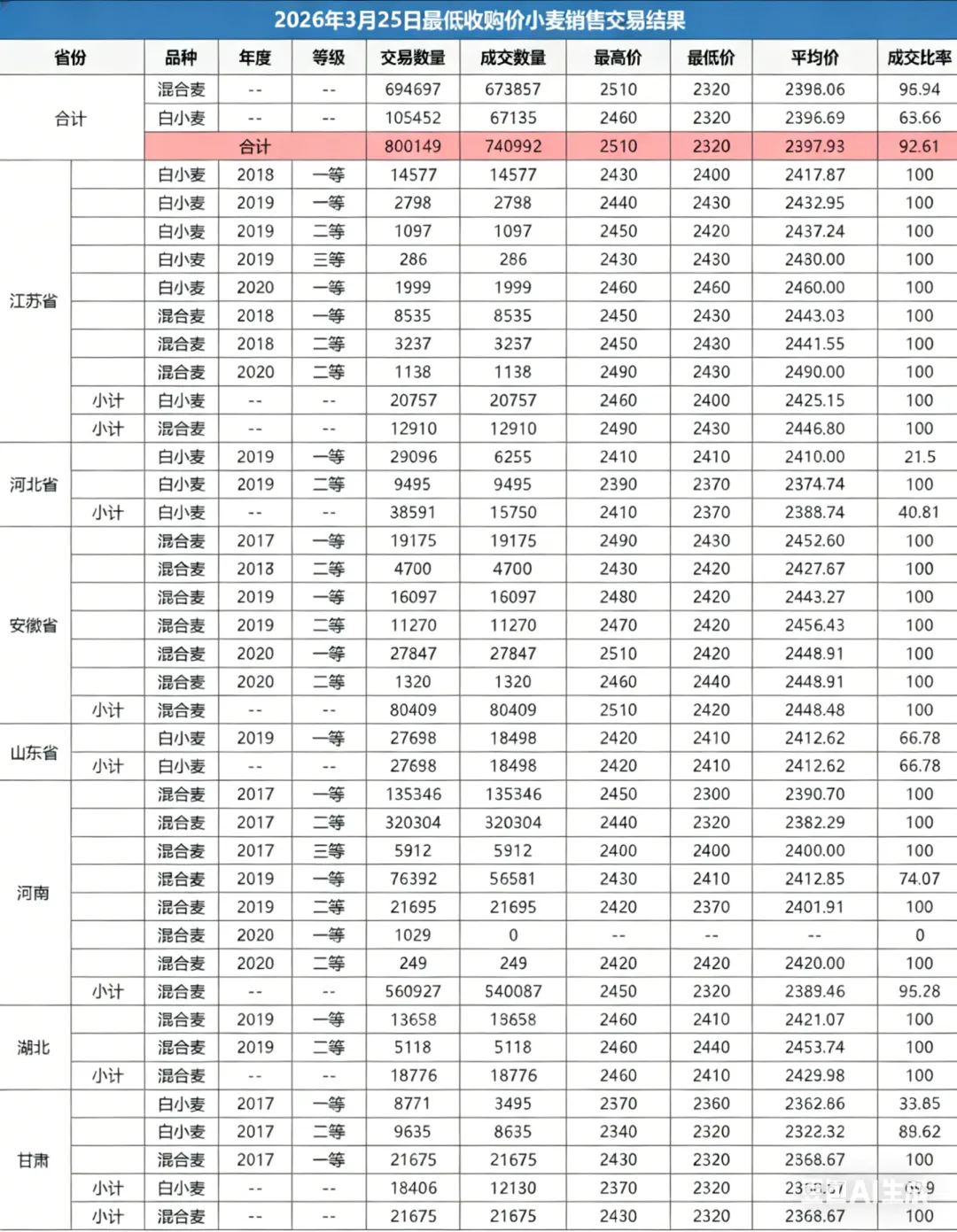 3 月 25 日最低收购价小麦计划销售 800149 吨,成交 740992 吨,成交率 92.61%。成交最高价 2510 元 / 吨,最低价 2320 元 / 吨,成交均价 2397.93 元 / 吨。