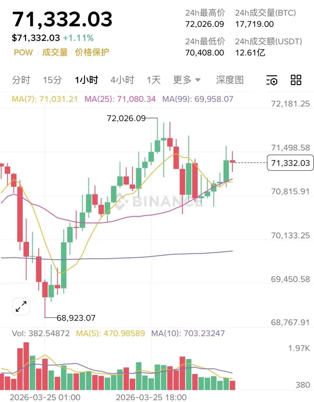 以当前盘面来看,大饼在71000附近整理,昨天最高触及72000后承压回落。四小时图MACD红柱连续缩短,价格与指标形成顶背离结构,上攻动能明显衰减。小时图均线粘合,MACD零轴徘徊,预计在70,800-71,800区间震荡且午后冲高72000后快速回踩,所以蒋哥这边的操作建议还是以高空为主。