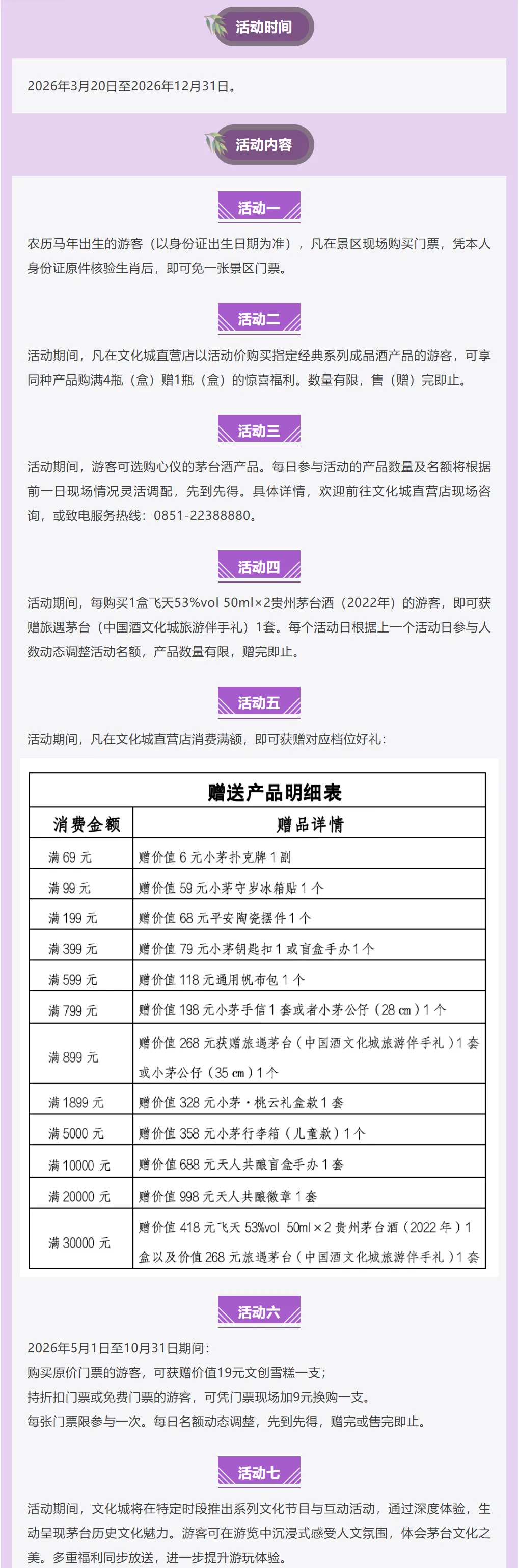 根据茅台文旅官方账号显示,从3月20日到12月31日,酒文化城举办多种优惠活动,除马年出生的游客可免门票入场外,还有多种组合购酒活动。