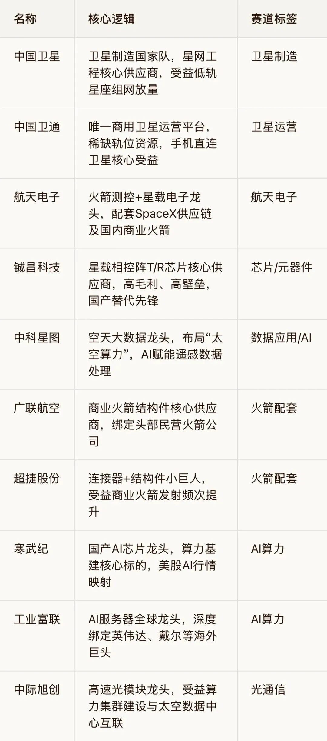 基于“商业航天+AI算力”的双主线逻辑,我们筛选出覆盖火箭制造、卫星应用、算力芯片等关键环节的10只标的。
