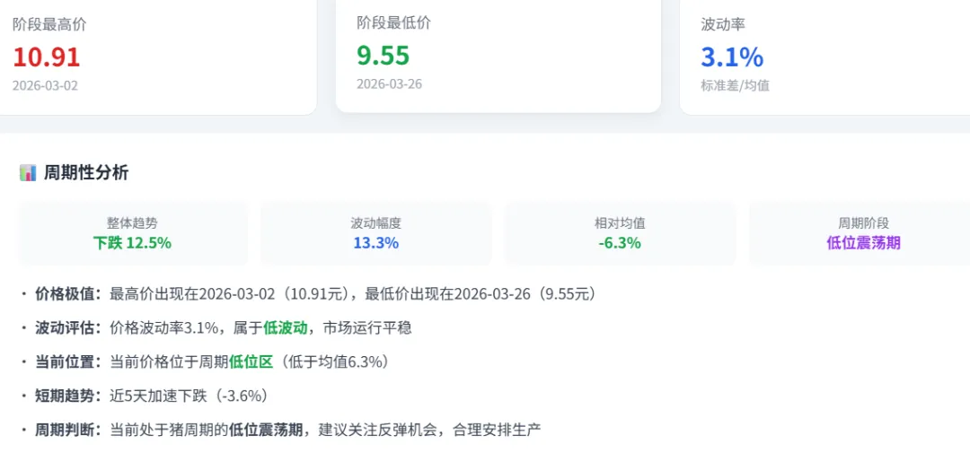 🔗 产销价差分析:猪肉(17.69) - 生猪(9.55) =8.14元(价差率85.3%)。价差率较高,屠宰利润丰厚,但终端消费承压,需警惕价格回调风险。