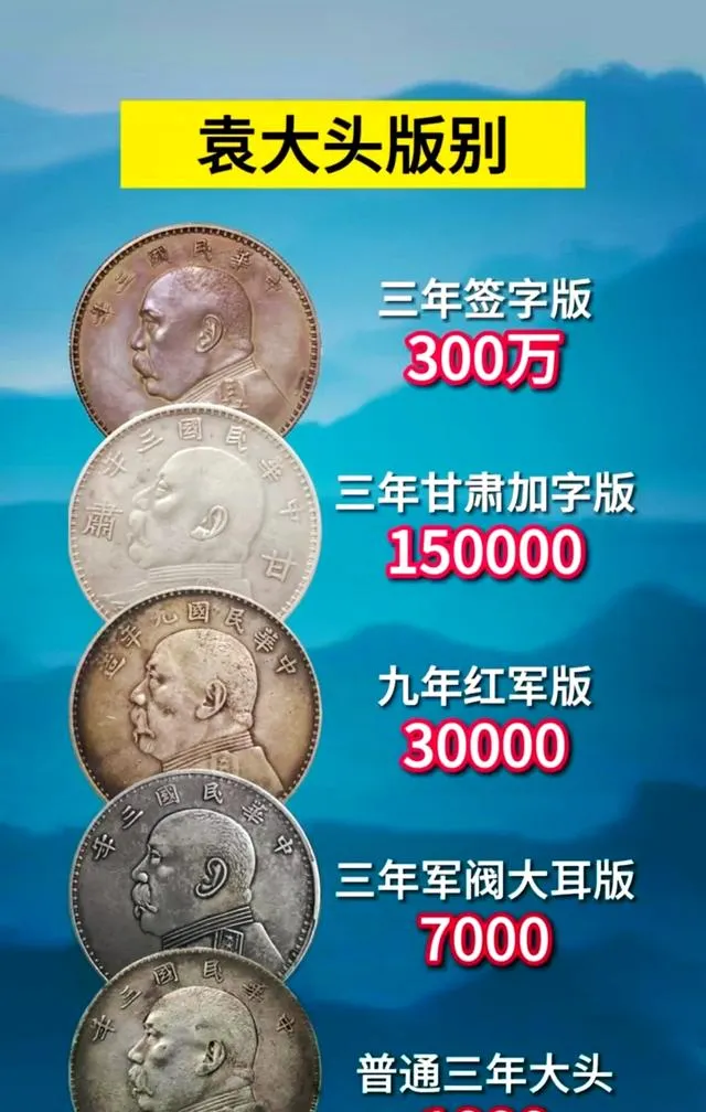 图中一堆横着竖着的银元头像,行里叫袁大头版别榜,有的光听名就心跳加速,比如上头那个三年签字版,红色数字三百万,不是手滑多打了零,真就值这么多,家里能翻出来这版顶着,直接退休没跑,下面还有甘肃加字版十五万、红军版三万,带军阀大耳的七千,最末尾普通三年大头,一千出点头,不算拉垮,也非随手可丢的货色,有人拉着我问,咱家这种普通三年大头值不值留,放以前确实没谁稀罕,这会行情一翻,普品都能叫板。