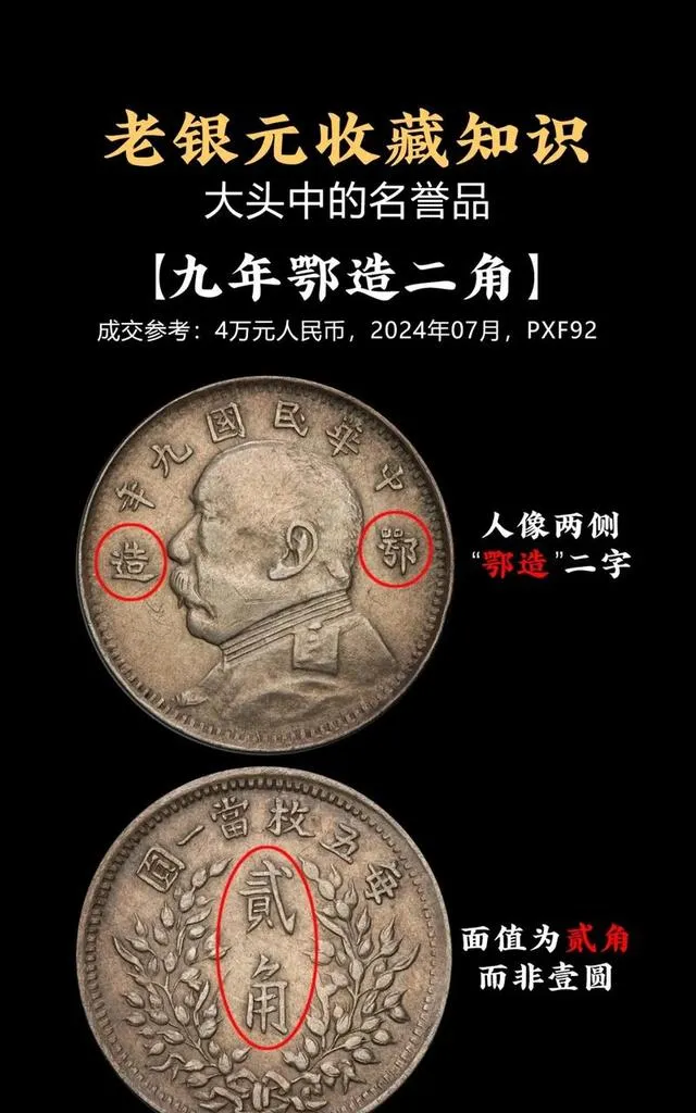 有经验的直接看图上这币,九年鄂造二角,正面头像别眼熟了,关键看字圈,“鄂造”两个字特地挑红,背面面值标明贰角不是壹圆,这个品种在市面上都是行家追着买,最新成交参考价四万,去年下半年还不到这价,今年银价出来直接呼上去了,我记得小时候家里有亲戚还真在旧市场淘过一个,放在床底小铁盒里,说是有别的板别但没人见过真货,现在行情翻了三倍那亲戚乐得嘴都合不拢。