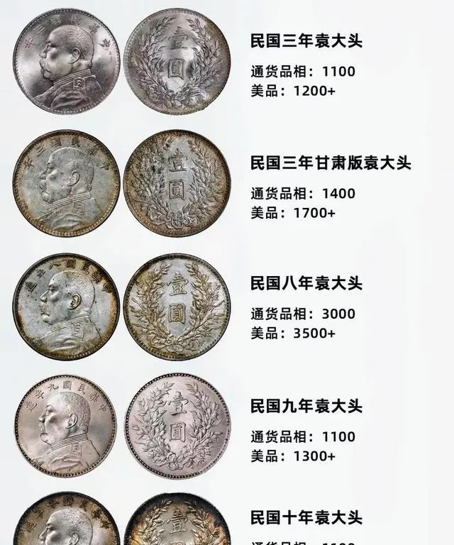 想知道那玩意现在到底能卖多少,直接看这个价格对照表,最顶上民国三年袁大头通货1100,品相好些1200还要往上走,甘肃版普品都破1400了,八年那版直接三千起步,美品更高,九年和十年大头反而回归朴素,收藏圈有句话,没有所谓垃圾版别,全看你能不能碰上对的行情,今年银价加上藏家互换,普品都能抬头,家里压着别瞎卖,得问问懂行的或者托拍一拍。