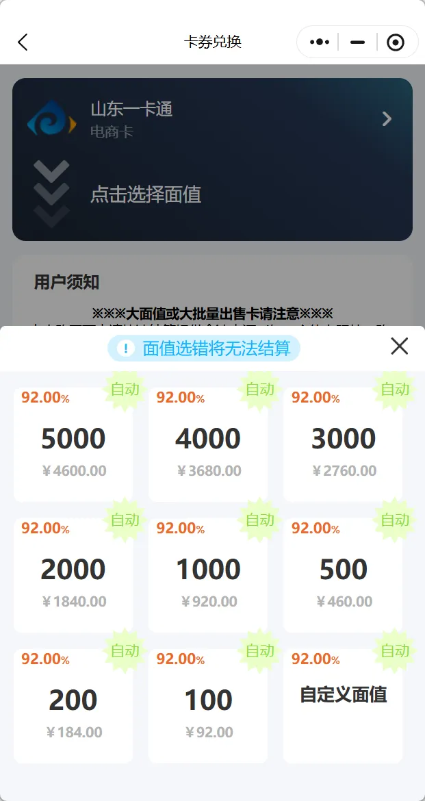 从目前市场情况来看,山东一卡通的回收行情相对稳定,整体参考折扣大约在 92折左右。例如: