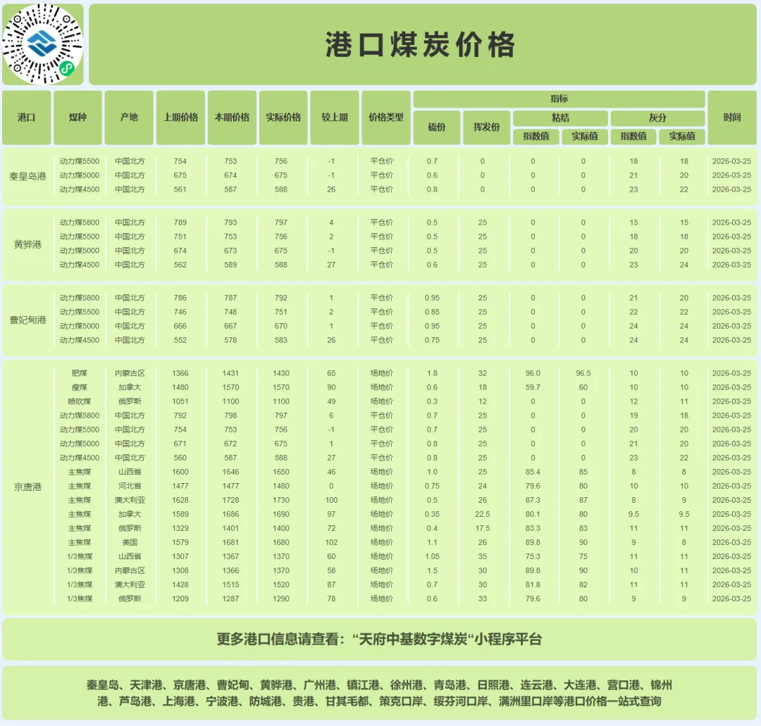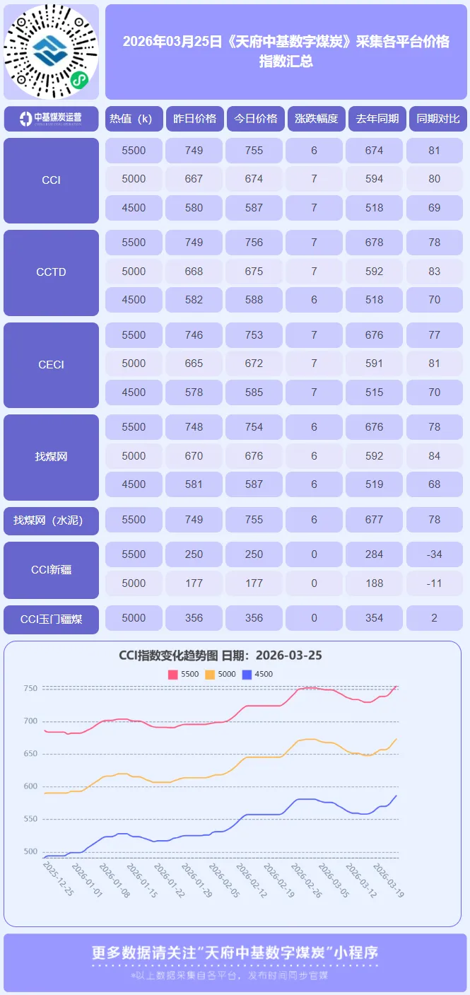 2026年3月25日,国内动力煤市场延续 “成本驱动与预期改善共振” 的强势格局,CCI指数显示5500大卡、5000大卡和4500大卡价格分别上涨6元、7元和7元/吨,报收于755元/吨、674元/吨和587元/吨。此番普涨标志着市场已成功扭转3月初以来的阴跌态势,进入由 “强成本支撑”与“弱需求现实”博弈 下的震荡上行通道,其核心逻辑已从单纯的供需定价,转向 “全球能源危机风险溢价”与“国内结构性需求” 的双重驱动。