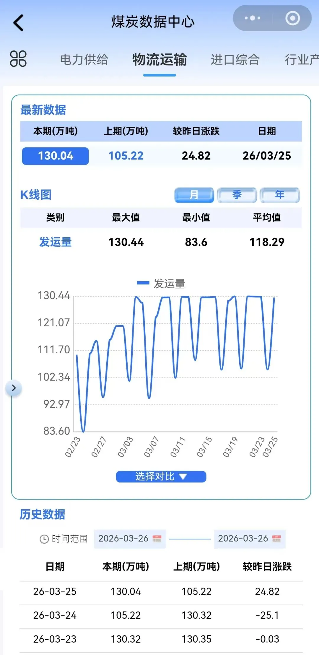 截至3月25日,大秦线日发运量为130.04万吨,较昨日上涨24.82万吨。