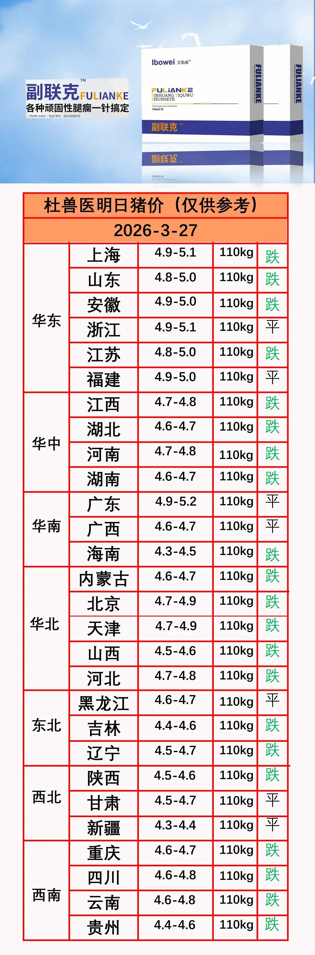 杜兽医团队为您带来2026 年 3 月 27 日的最新猪价参考。今天的行情依旧是跌多平少,全国大部分地区还在往下探,不少家人都在问:“还要跌多久?4 月能不能涨?” 今天咱就把行情说透,把未来的路也给大家捋清楚!