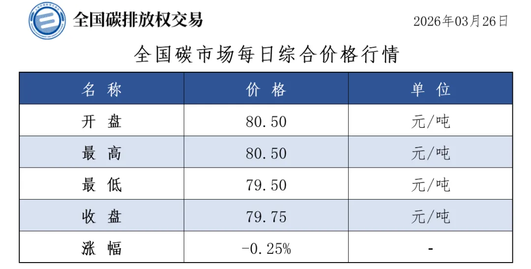 今日全国碳市场综合价格行情为: 开盘价80.50元/吨,最高价80.50元/吨,最低价79.50元/吨,收盘价79.75元/吨,收盘价较前一日下跌0.25%。