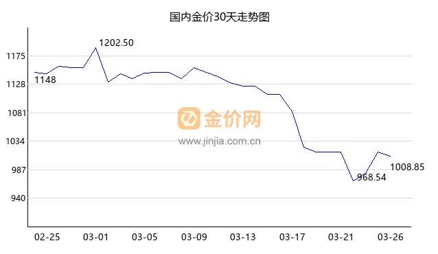 今日国内金价下跌,现价1004.35 元/克,下跌-0.47%,今日开盘价1018.00,最高价1019.46,最低价1003.98。