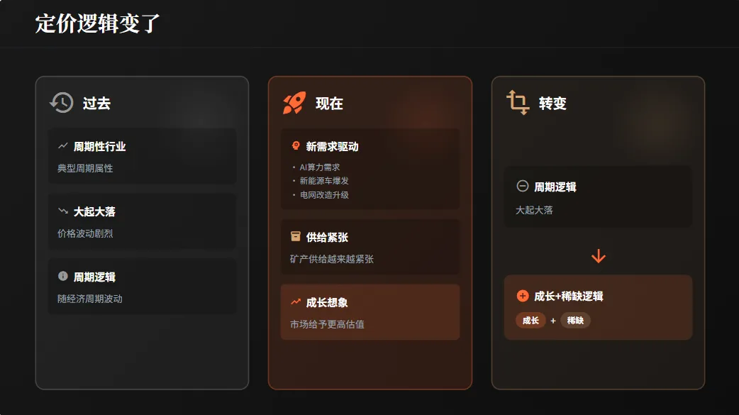 那跌了之后,现在贵不贵?截止3月13号,估值PE市盈率,30.61倍,百分位43.77%,市净率PB是4.28%,百分位是98.13%,综合看处于近5年中等偏上一点的位置。但要注意,现在市场给有色金属的定价逻辑,和过去不一样了。过去大家觉得它是典型的周期性行业,大起大落。但现在,AI、新能源、电网这些新需求,给了它很强的成长想象空间。同时,全球的矿产供给越来越紧张。所以,市场愿意给它更高的估值,这是从“周期”逻辑向“成长”和“稀缺”逻辑的转变。