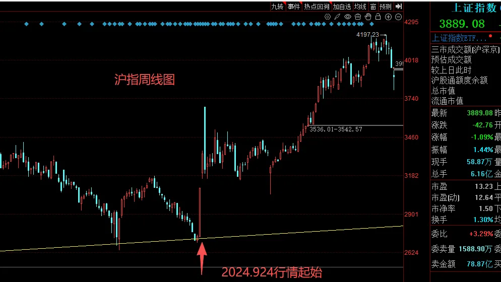 今天两市缩量下跌,回补了昨天上涨缺口。近期行情快速回落最低跌破3800点,当下看从2024年924行情沪指从2689涨到4197这个上涨趋势行情结束了?见顶了,还是上涨途中的一次大的调整?