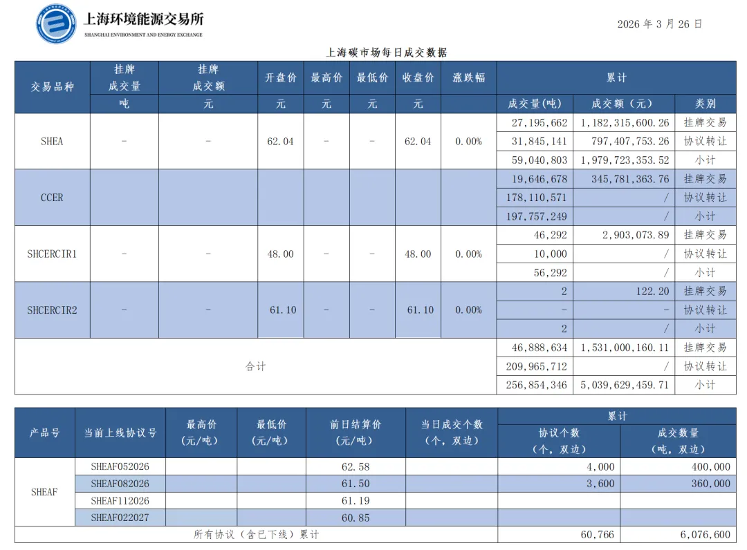 截至今日,上海碳市场所有现货品种累计成交量256,854,346吨,累计成交金额5,039,629,459.71元。其中,配额累计成交59,040,803吨,成交金额1,979,723,353.52元;CCER累计成交197,757,249吨;SHCERCIR1累计成交56,292吨;SHCERCIR2累计成交2吨。上海碳配额远期产品累计成交数量6,076,600吨。