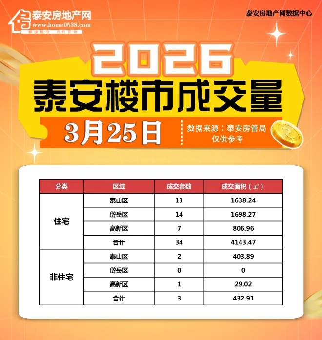 【泰安房地产网讯】据本站不完全统计,2026年3月25日泰安市共成交商品房37套,其中住宅网签34套,总面积4143.47㎡,办公、商业网签3套,总面积432.91㎡,与3月24日相比环比下降69.17%。