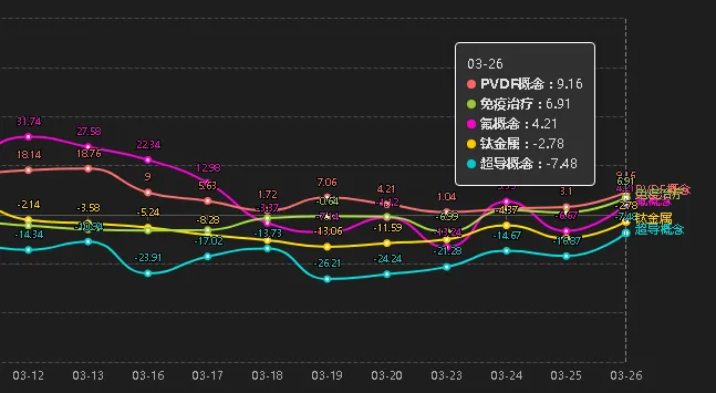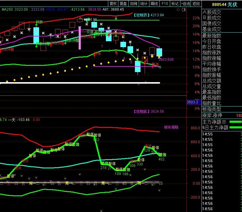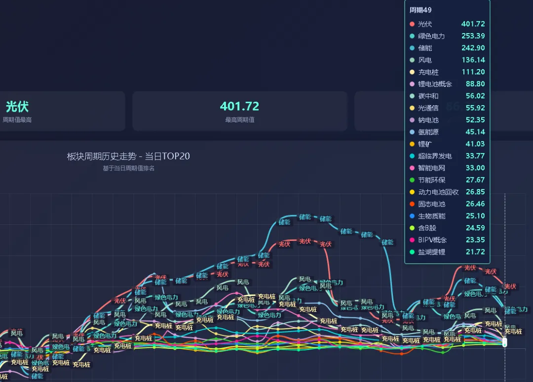 市场强度天花板BOLL版 板块周期最高值光伏401,板块周期区间200到500属于震荡取强,500到1000以上才是主力拉升。一个中小周期到1000基本就结束了。