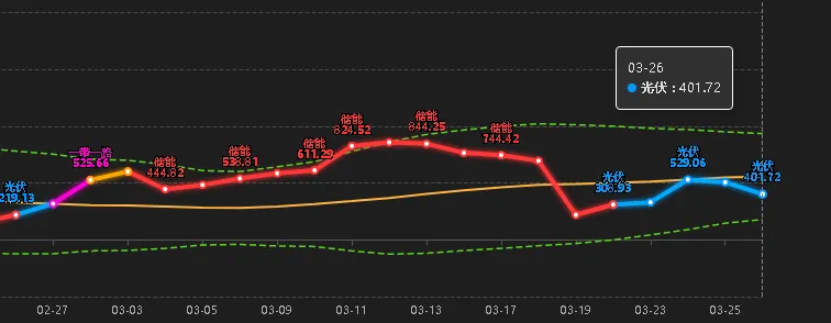战争引发能源危机,国内绿能新政。板块周期达到401,目前是能源的二波行情。今天早盘,能源下杀,量化趁机做T,接下来注意节奏。