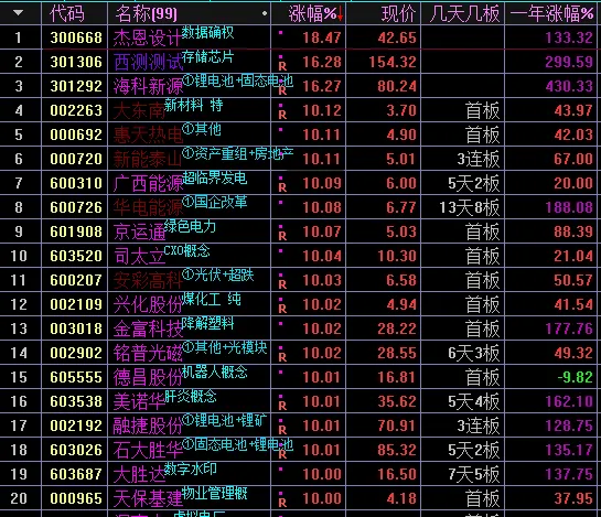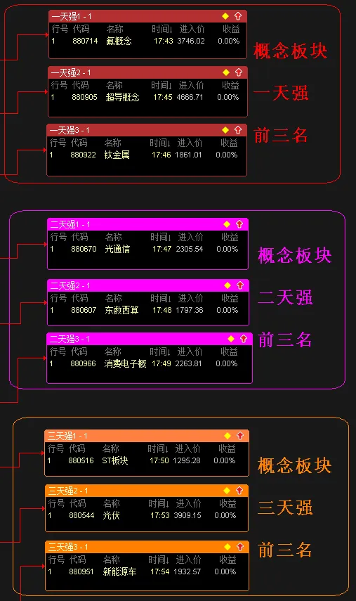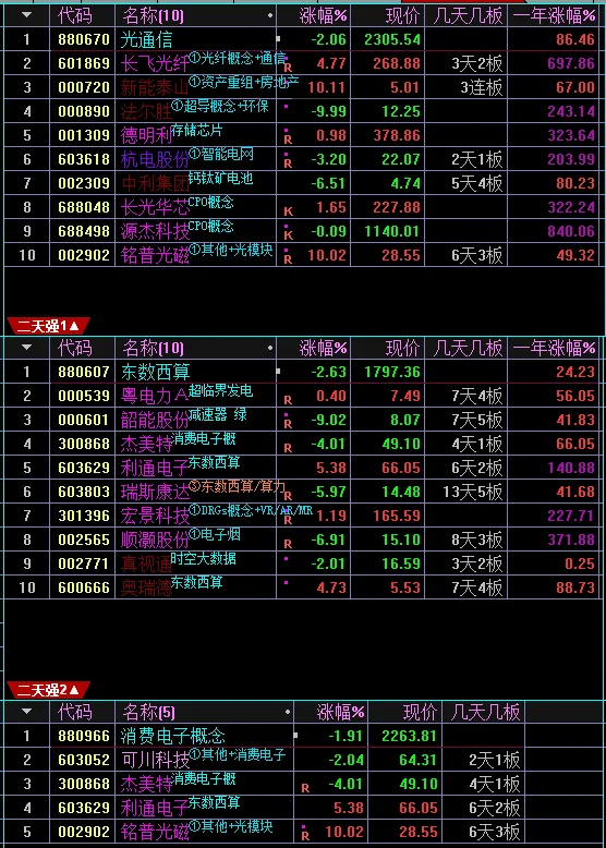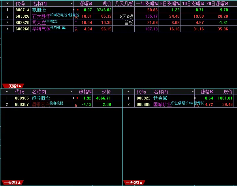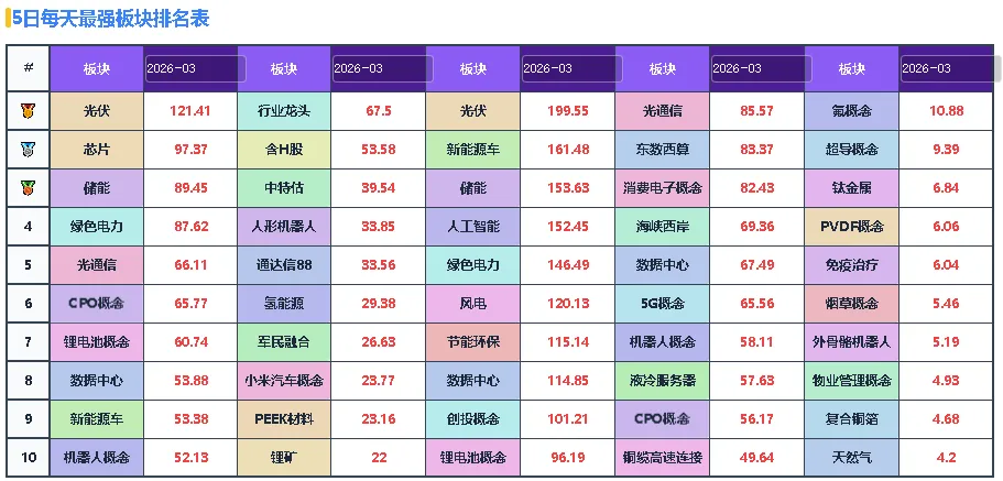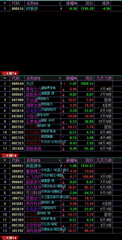 光伏401,可以从每天最强板块中找到题材的细分方向。绝对强者(当下板块周期前五名)储能、风电、绿色电力、光伏、数据中心。5日每天最强板块排名 光伏、人工智能、储能、智能电网、绿色电力。上升趋势是指板块周期有趋势性上涨倾向的板块,有些弱势板块在行情轮动期间也能上涨,注意区分。连涨几天是指板块周期数值持续上涨了几天,一个主线板块必然从连涨开始。连涨强势股 没什么好说的,都是阶段好股,注意避开量化一日游的个股。3天最强板块共9个,光通信、智能电网、绿色电力、数据中心、消费电子、东熟悉算、储能等、氟概念、超导概念。温馨提示:由于订阅号一天只能发一篇群通知文章,请把公众号设置星标,这样就不会错过最新文章。