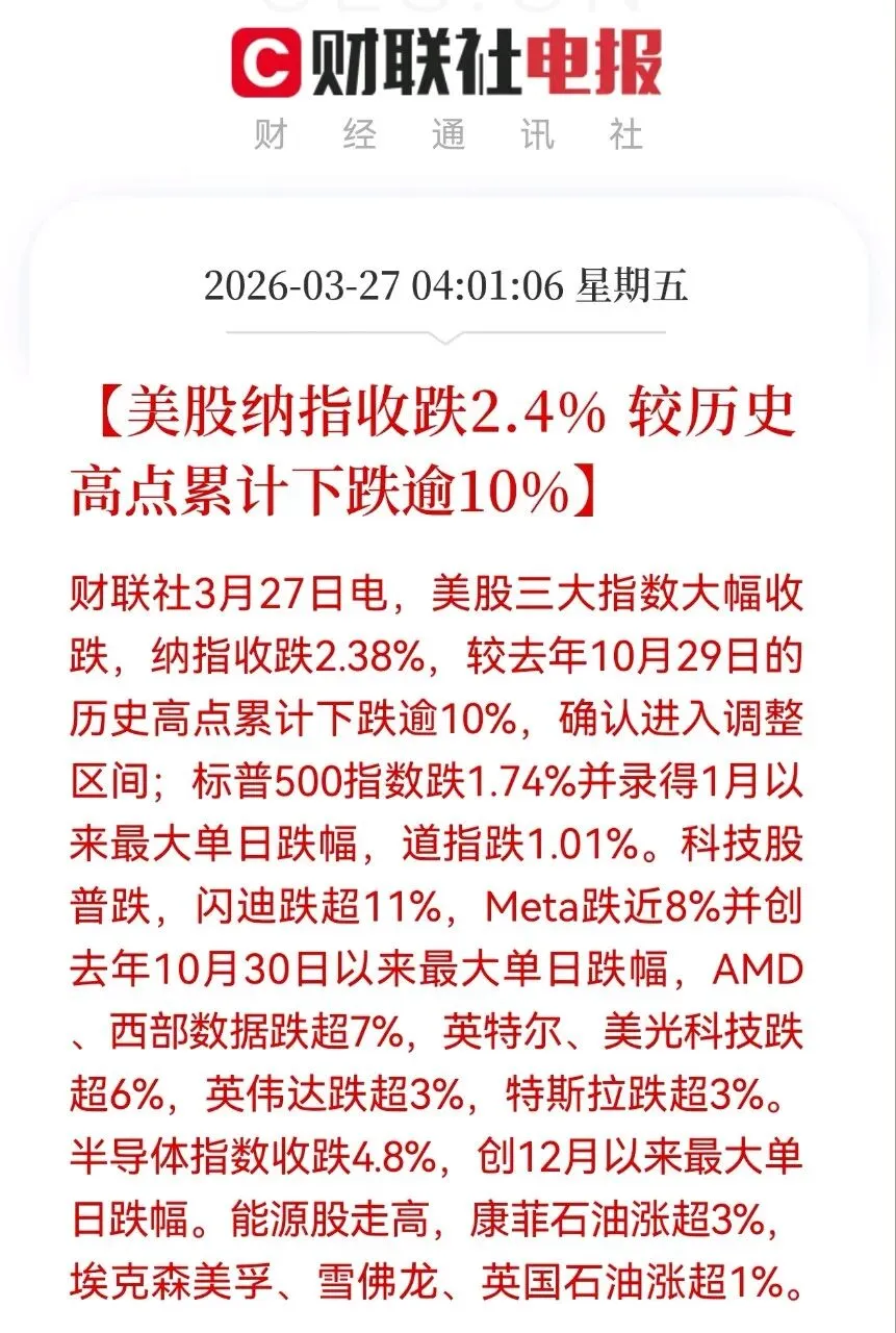 表现:纳指收跌2.38%,标普500跌1.74%,道指跌1.01%。科技股全线崩盘,闪迪跌超11%,Meta跌近8%,半导体指数创12月以来最大单日跌幅。