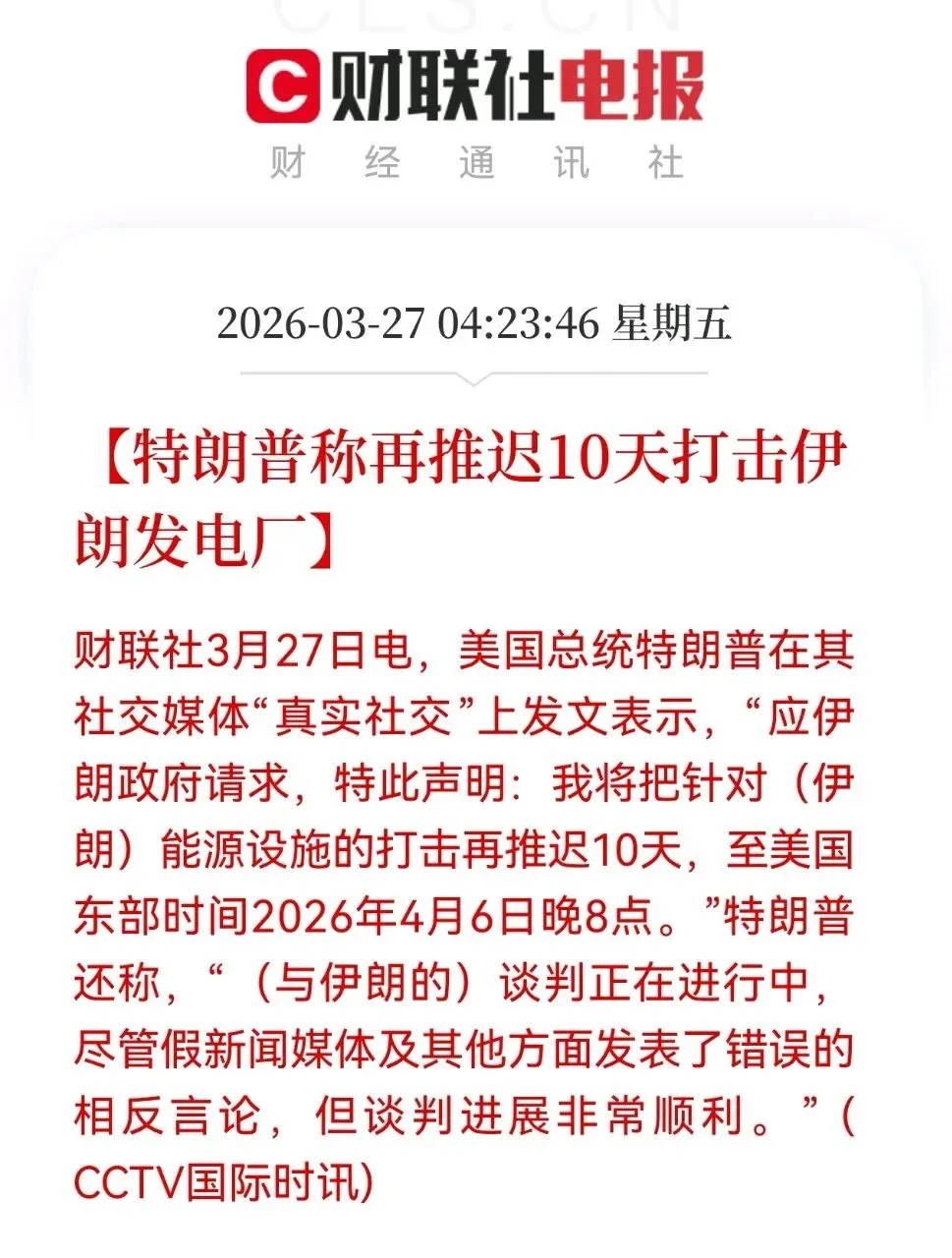 动态:特朗普宣布将打击伊朗能源设施的时间推迟10天至4月6日,称谈判进展顺利。
