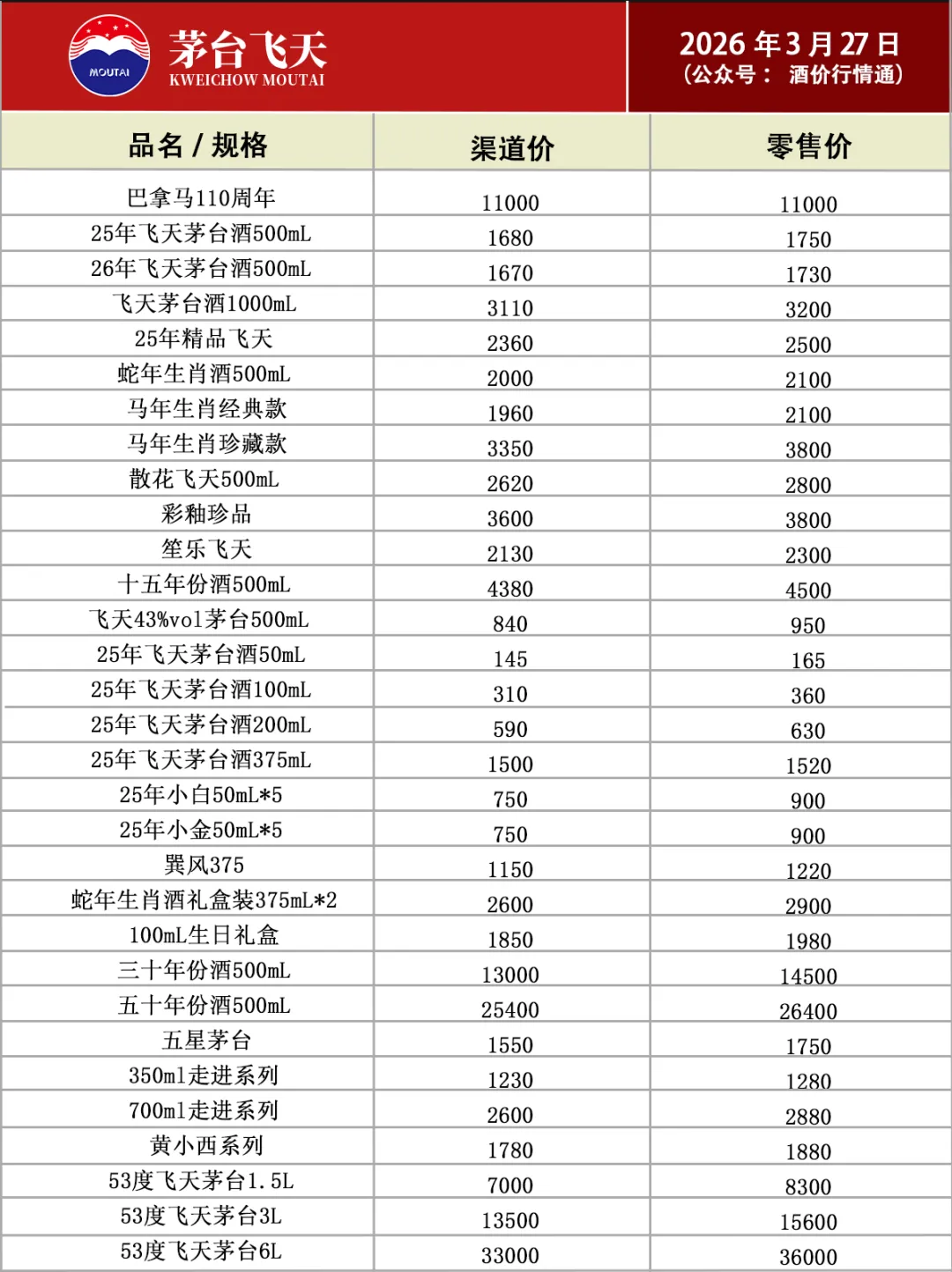 飞天价格平稳!3月26号酒价行情