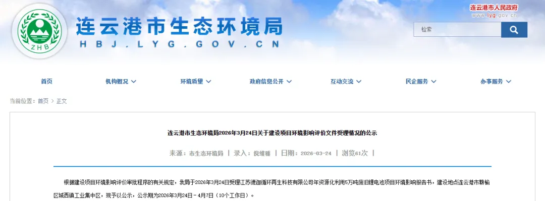 3月24日,连云港市生态环境局发布《江苏德迦循环再生科技有限公司年资源化利用5万吨废旧锂电池项目》环境影响报告书受理公示。
