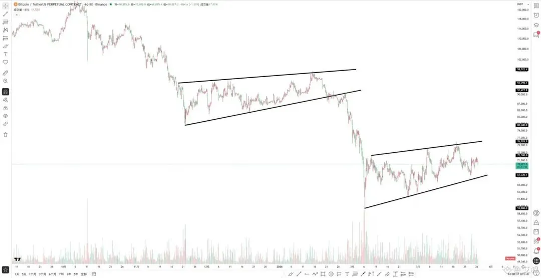 从结构上看,BTC这几天一直在 69k-72k 上下做区间换手,前面从低位反弹上