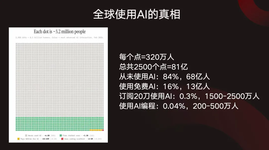 当社交媒体上仍在渲染“AI全民普及”的幻象,一组真实数据,已然戳破技术叙事的泡沫——全球人口中,84%的人从未接触过任何AI工具,仅16%用过免费对话服务,付费订阅用户占比不足0.3%,能将AI融入生产的专业人群仅0.04%。这份冰冷的统计,正是当前AI行业的真实底色:技术狂欢退潮,行情回归商业本质,行业正式进入“效率决胜、合规生存”的硬核阶段。那么Ai目前的其他情况怎么样呢?