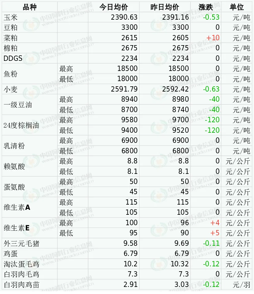 26日DDGS价格坚挺。终端养殖需求一般,饲料企业观望心态较浓,酒精企业多消化前期合同,市场走货表现一般,且豆粕现货价格震荡调整,市场缺乏其他利好因素支撑,DDGS价格暂稳运行。预判3月份期间大多数时候产区DDGS交易价格总体稳中略显偏强走势为主的可能性更大下旬止涨转弱的几率将逐步提高,月度均价环比继续上涨的几率在逐步提高。因中美领导人的会晤日期定于5月中旬,改善市场人气,加之逢低买盘活跃支撑CBOT大豆基准期约收高1.5%。目前通关的大豆数量较少叠加工厂持续开机压榨后库存下降,但不少需求端提走前期购买的合同,导致豆粕库存下降后出现多家工厂限量提货情况,支撑工厂对豆粕的挺价意愿。但随着后续通关大豆数量增多,将缓解当前供应偏紧态势,豆粕库存有望止跌回升,且生猪养殖亏损导致需求有限,豆粕价格或处于震荡偏弱运行行情。今日棉粕市场价格稳定为主。整体油厂大豆库存回落,国内油厂压榨回升,但后续存在季节性检修计划,豆粕库存回落。下游库存备货后,成交情绪回落,利空豆粕。不过棉粕产出恢复慢,供应端压力不大,并且棉籽价格坚挺,对其成本支撑,其中新疆昌吉棉籽为1.3-1.35元。预计棉粕价格震荡偏强。今日郑州菜粕期货低开后震荡上涨。加拿大油菜籽期货收盘略微上涨,基准期约收高0.5%,追随芝加哥豆油市场的飙升行情。菜粕现货小幅上涨。菜籽买船利润高位,供应存在回归预期。华南地区逐渐接近水产备货季节,今年水产投苗较早,有望提前启动需求;另外豆菜粕价差拉大后菜粕重回性价比。短期继续震荡调整为主。外盘方面,秘鲁鱼粉厂商保持挺价意愿,秘鲁新季超级蒸汽鱼粉预售参考价格为CNF2500美元/吨,据悉外盘市场成交活跃,预售量达到10万吨以上。国内进口鱼粉市场,鱼粉到货慢,库存下降至15万吨。当前秘鲁超级蒸汽鱼粉价格集中在18400-18500元。短期鱼粉持货商保持观望挺价。今日小麦市场价格继续震荡偏弱运行。政策投放加码施压、需求跟进乏力、持粮主体变现意愿增强,小麦价格延续弱势调整。而面粉消费正处于季节性淡季,加工企业利润受压,采购谨慎多以刚需补库为主,同时玉米价格回落,小麦的饲用替代有所下降,部分饲料企业采购意愿减弱,小麦价格将维持弱势震荡行情。昨日油脂期货价格震荡下跌。中东局势仍存变数,国际原油价格不断波动,短期内仍将是影响国内外油脂价格走势的重要因素。国内豆油库存低位去库放缓、终端需求平淡,叠加国际油价回落拖累,现货基差走弱,预计近期豆油现货价格震荡偏弱。受战争影响,运价上涨,到港时间延长,下游采购意愿增加,乳清粉市场购销好转,稳中偏强运行,后续需注意到货量进展以及港口库存量等因素。2025年12月,我国赖氨酸与赖氨酸盐及酯的出口量为9.8万吨,同比增0.4%,环比增8.4%。3月3日起星湖伊品氨基酸产品上调200-300元/吨。3月5日大成生化氨基酸产品上调100-500元/吨。3月6日金玉锋98%赖氨酸报价6.65元/公斤,70%赖氨酸报价4.65元/公斤。3月9日星湖伊品大品种氨基酸上调200-1000元/吨。3月16日星湖伊品大品种氨基酸上调300-1000元/吨。2025年12月国内蛋氨酸进口量为2.1万吨,同比增10.6%,环比增66%2月27日市场称安迪苏液蛋计划提价1元/公斤。3月4日市场称固蛋厂家多为停报。3月6日市场称赢创蛋氨酸报价上调10%。3月9日市场称赢创新加坡工厂受原料短缺影响,蛋氨酸部分生产设施被迫停产。3月19日新和成液蛋报价上调20%,蛋氨酸市场偏强运行。欧洲VA1000市场报价16-17欧元/公斤。2026年1月市场称国内部分厂家VA产品提价至70-75元/公斤。3月9日市场称国内厂家停报,3月24日市场称有厂家报价150元/公斤,市场成交上行。欧洲VE市场报价7-8欧元/公斤。2月5日市场称新和成VE产品出口报价上调15%。3月初部分厂家VE产品提价至75元/公斤,3月23日市场称国内有厂家提价至120元/公斤,VE市场偏强运行。全国均价为9.58元/公斤,较昨日价格下跌1.12%。当前市场仍处供应高峰,养殖端深度亏损,虽有收储及产能调控政策托底,但短期效果有限。终端消费依旧疲软,屠宰走货一般,预计近期猪价仍震荡偏弱。今日鸡蛋价格稳定。市场处于供应紧平衡状态,养殖端库存偏低,叠加清明节前备货启动、猪肉与蔬菜价格带来的替代需求支撑,不过产蛋鸡存栏仍处相对高位,上涨空间有限,预计近期鸡蛋价格震荡运行。今日主产区山东鸡蛋均价6.54元/公斤,与昨日价格持平;河北鸡蛋均价6.33元/公斤,较昨日价格下跌0.03;广东鸡蛋均价7.27元/公斤,与昨日价格持平;北京鸡蛋均价6.70元/公斤,与昨日价格持平。全国淘汰蛋毛鸡均价下跌。市场淘汰鸡货源供应相对充足,而终端屠宰企业采购需求未有明显提升,加之市场消费端暂无利好刺激,部分地区淘汰鸡价格出现小幅下调。短期淘汰鸡市场缺乏利好支撑,价格难有大幅波动,预计近期淘汰鸡价格仍将稳中偏弱运行。今日山东地区淘汰蛋毛鸡均价10.70元/公斤,较昨日价格下跌0.30;江苏地区淘汰蛋毛鸡均价10.60元/公斤,较昨日价格下跌0.20;辽宁地区淘汰蛋毛鸡均价10.40元/公斤,较昨日价格下跌0.20。白羽肉毛鸡价格稳定。市场供应充足,屠宰企业因终端鸡肉消费平淡、产品走货疲软且库存偏高持续压价收购,叠加双氧水鸡爪事件影响仍未完全消退,清明备货提振有限,养殖端利润收缩、补栏意愿低迷,预计近期白羽肉鸡价格震荡调整。今日主产区山东白羽肉