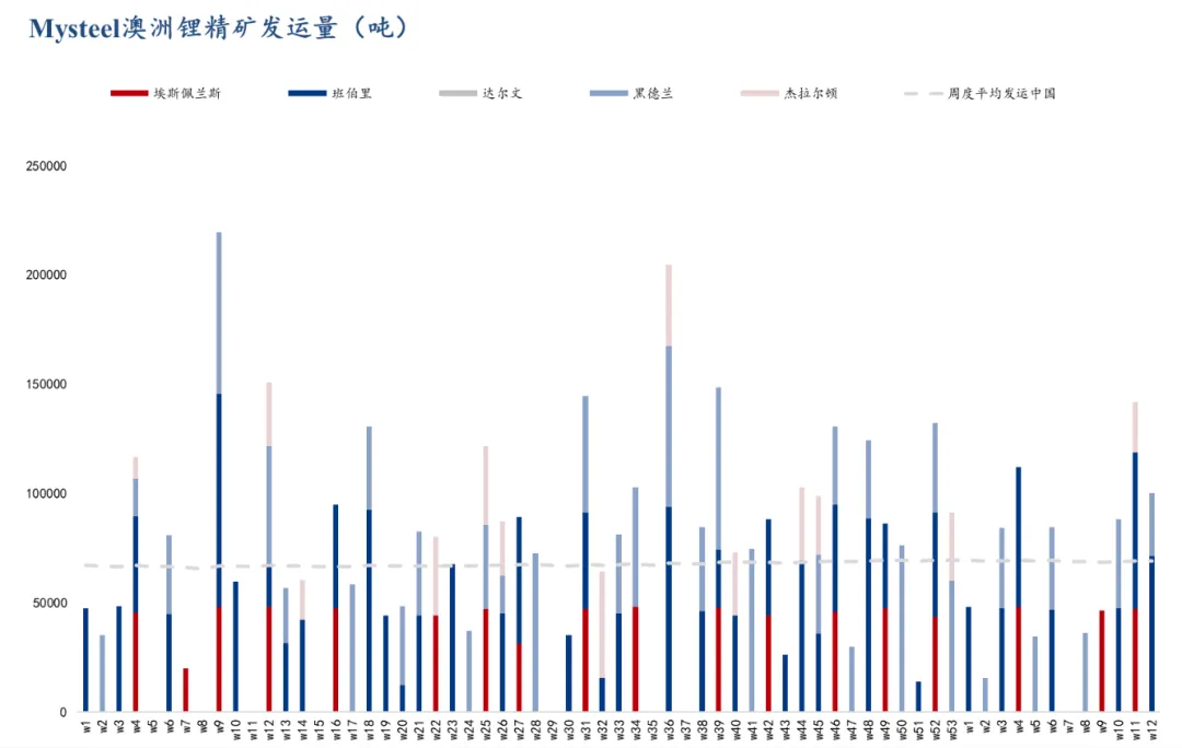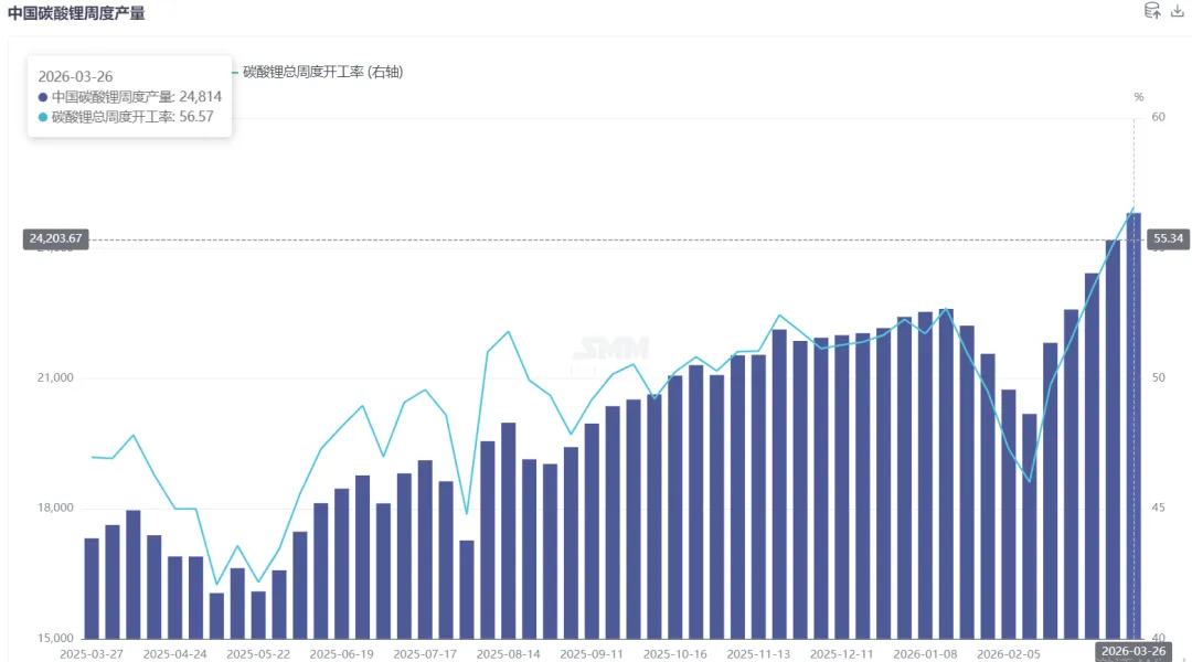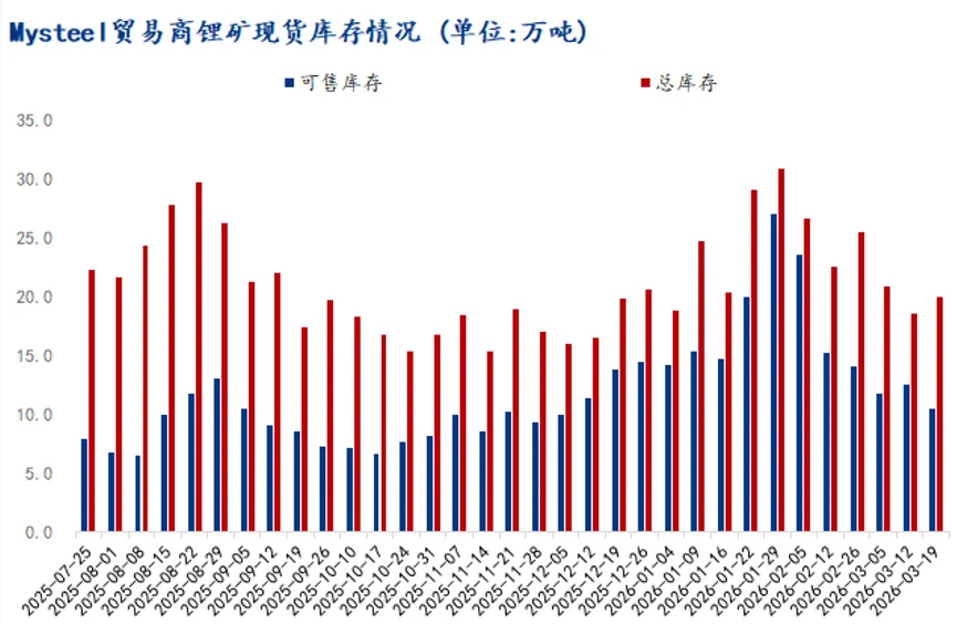 供应端:原料端锂矿价格随碳酸锂价回调而震荡走弱,海外矿商在价优时放货意愿走高,冶炼厂询价买货也相对积极,市场成交情况有所转好。上游冶炼厂采取挺价惜售策略,冶炼厂周度库存小幅回升。进出口方面,中国2026年2月碳酸锂进口量为26,426.79吨,环比下降1.61%,同比增长 114.36%。智利是第一大进口来源地。智利出口量及均价皆有明显回升,预计船期到港后,国内碳酸锂供给或将保持充足。据Mysteel统计,截至本周(3月19日),32家样本锂矿贸易商锂矿现货港口+仓库库存20万吨,环比上周上升1.5万吨,其中可售库存10.5万吨,环比上周下降1.5万吨。锂矿价格小幅下降,锂盐企业原料补库需求旺盛,本周海外矿发运存在集中到港情况,贸易商现货库存增加,但部分头部矿贸直接出矿意愿下降,锂矿可售库存小幅下降。据SMM最新数据,上周周度产量增加628吨LCE。