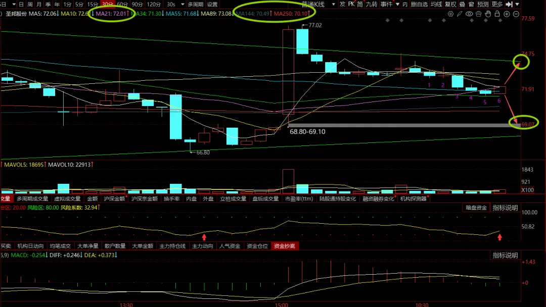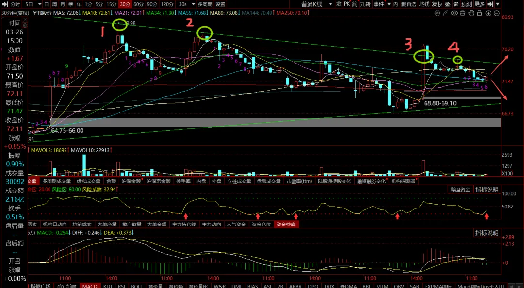 昨晚预测今天有会回踩55线概率(接近大盘平开低走趋势),等21/34线提上来。那么今晚我们放大图看:今天M21率先上穿M55,明天如果继续往上挑战趋势线,那么M5/9/21/34会继续上穿89线是大概率事件,正式形成多头排列。因此,我今天分别在早上加了5%试错仓,下午2:25再加了10%博弈明天早盘突破到74.74(今天最高价)附近高抛,降低成本。