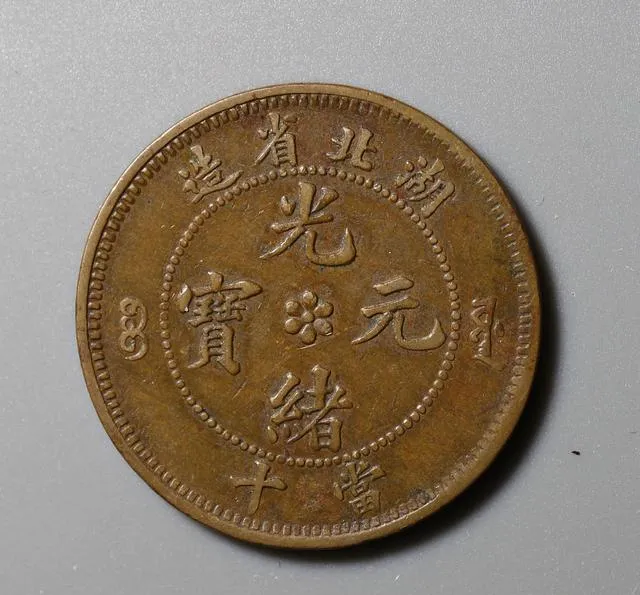 这张图上的老铜钱叫湖北省造光绪元宝十文,铜黄色,边齿一圈小点连缀,正面几字规规整整,手感沉甸甸,表面被岁月磨得光滑,放在手上有点温,小时候家里老辈人专门收着,说有稀版的那种“爪在须外”,人家开好几千一万都不带眨眼,现在行情虽稳但也挑品相,边上磨花点,价格立马差一大截,爷爷说,老物件值钱不值钱,全看会不会养,看着不起眼,其实门道全在细节上。