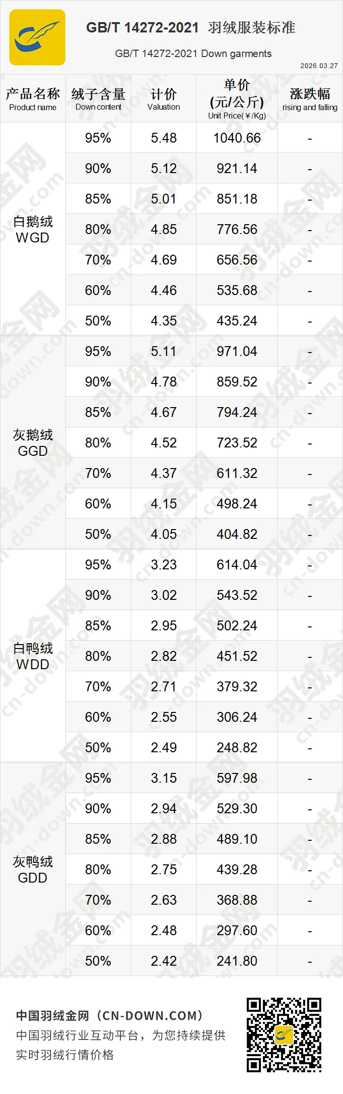 GB/T 14272-2021 羽绒服装标准行情