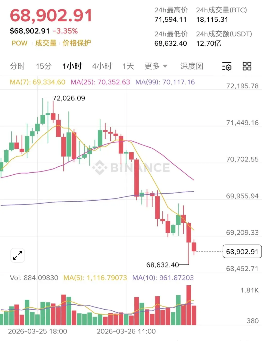 以当前盘面来看,大饼四小时图MACD死叉开口扩大,绿柱持续放量,快慢线深陷零轴下方,空头动能主导,价格已跌破MA99,均线空头排列。小时图MACD低位粘合,绿柱缩短但快慢线仍在零轴下方,反弹乏力;RSI在35附近弱势运行。下方支撑在68500,若失守将加速下探至68000,蒋哥这边依旧是建议高空为主。