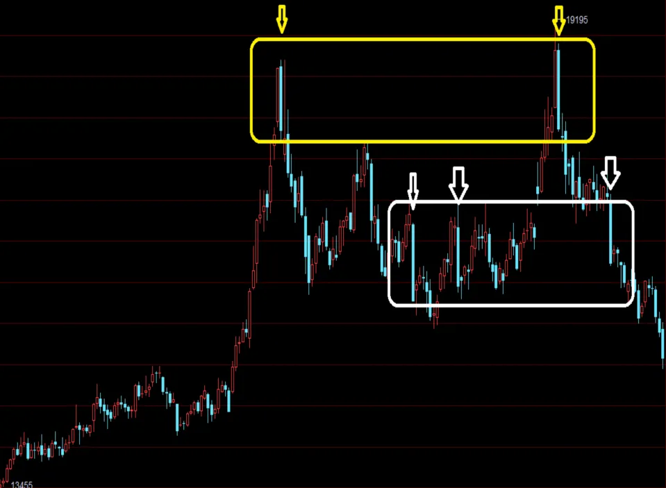 与多头守门双神相对应的,是空头守门双神形态的类似情况。在上图案例中,我们可以看到,在黄框所标识的价格高点区间,先后出现了两根实体较大的阴线。这两根阴线是价格自上涨起始以来,实体长度最大的阴线。这一情形充分表明,在该区域内空方已经具备了与多方分庭抗礼的强大实力。在空方占据主动优势的区间,价格想要出现良好的上涨行情将变得极为困难。所以,当在价格高位出现处于相同位置的大阴线时,投资者务必高度关注,因为这往往预示着做空机会的悄然来临。