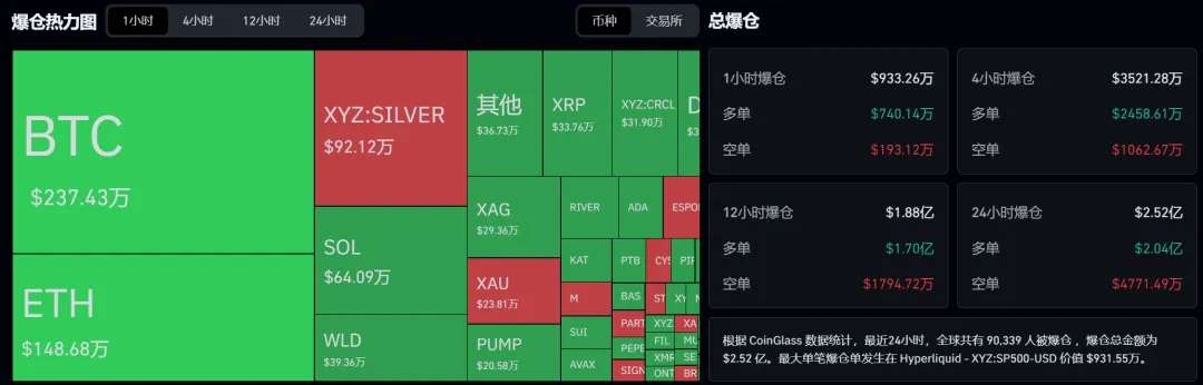 最近24小时,全球共有 90,339人被爆仓 ,爆仓总金额为 $2.52 亿。最大单笔爆仓单发生在Hyperliquid-XYZ:SP500-USD价值 $931.55万简单回顾今天公开单: