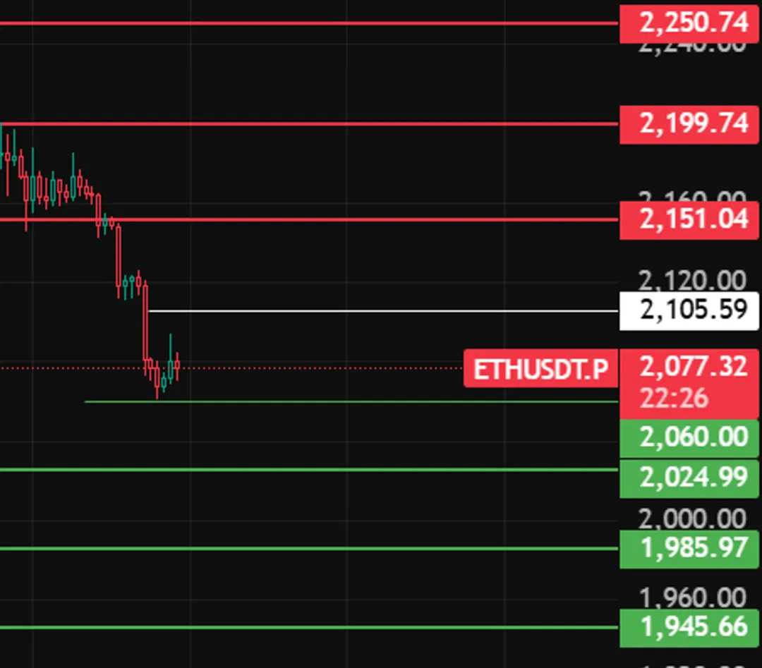 晚上以太坊留意2105位置,若反弹上不去,说明力度不够,还会继续往下走。下方支撑看2060、2025、1985、1945这几个附近!