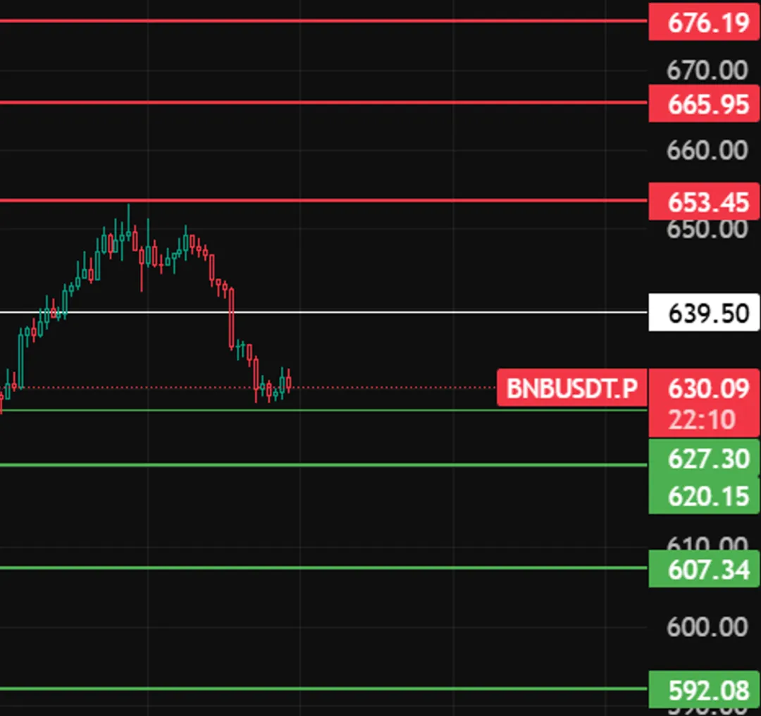 晚上BNB看639这个位置,若反弹上不去,说明力度不行,还会往下。下方支撑看627、620、607这几个附近!