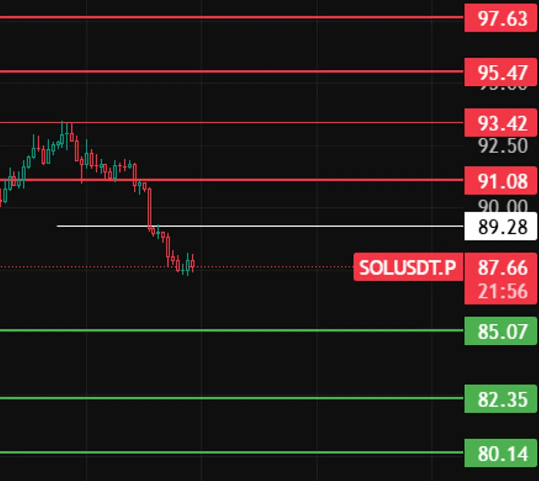 晚上SOL看89位置,若反弹上不去,说明没力度,还会继续往下走。下方支撑留意85、82、80这几个附近!