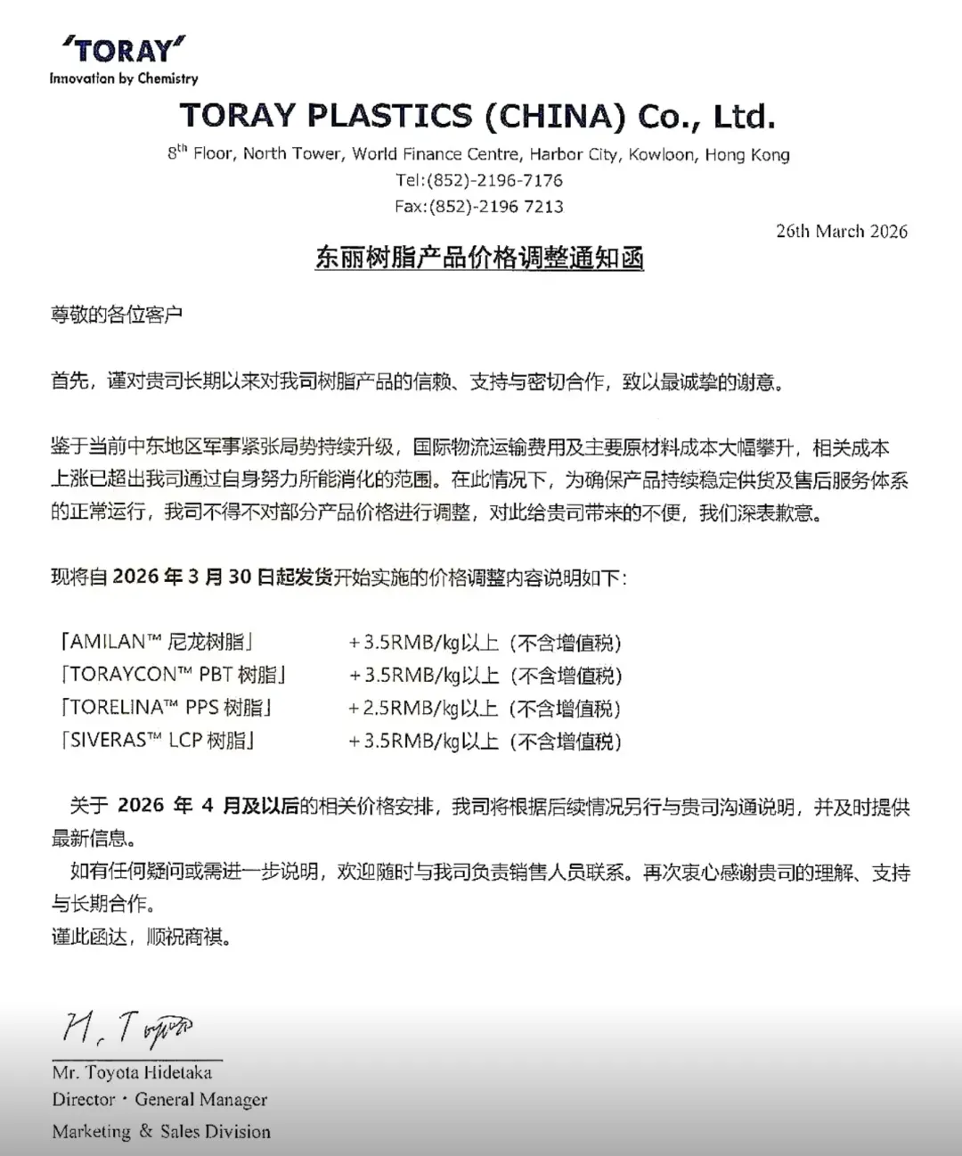 东丽宣布:3月30日起,尼龙、PBT、PPS、LCP全系列产品涨价,尼龙/PBT/LCP涨3500元/吨,PPS涨2500元/吨,高端工程塑料成本全面上移!