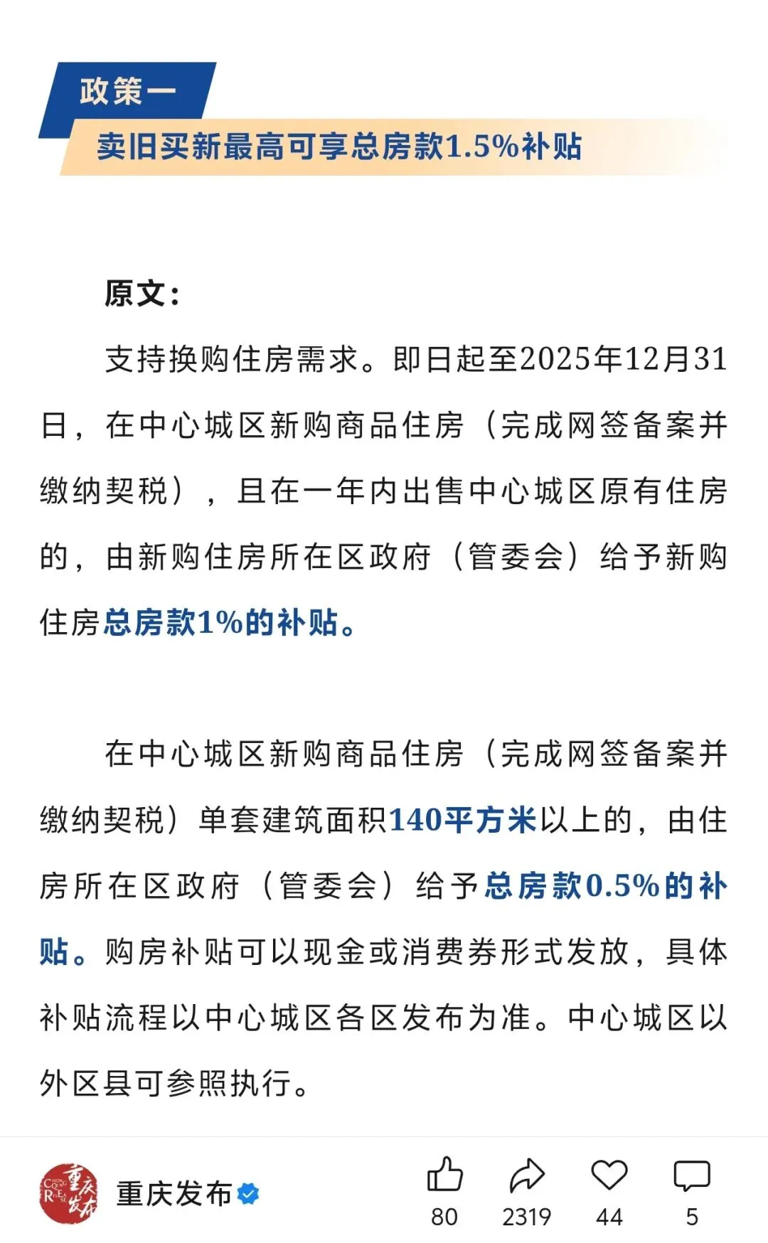 如果是在重庆本地置换,这里也给大家一个明确的方向:把远郊的房产换成核心板块的房产,把租售比拉垮、没什么收益的房产,换成租售比高、能稳定收租的优质资产。而且现在重庆的置换政策福利拉满,一卖一买之间,还能享受“个税退税”和“置换补贴”的双重优惠,能省下一笔不小的开支,变相降低了置换成本。