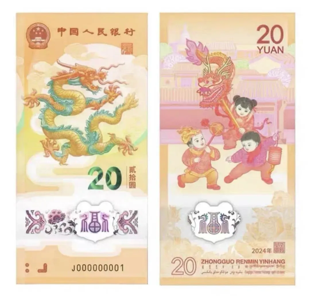 2024年1月9日发行,塑料钞,面值20元,发行总量1亿张。