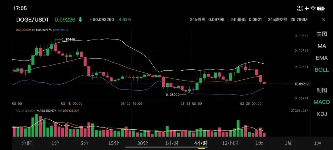 这是你提供的2026年3月26日狗狗币4小时级别K线图分析: