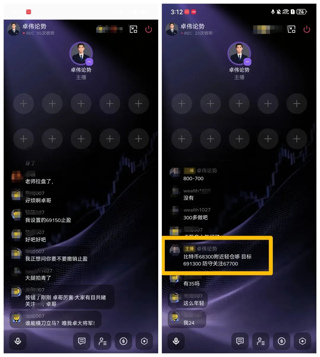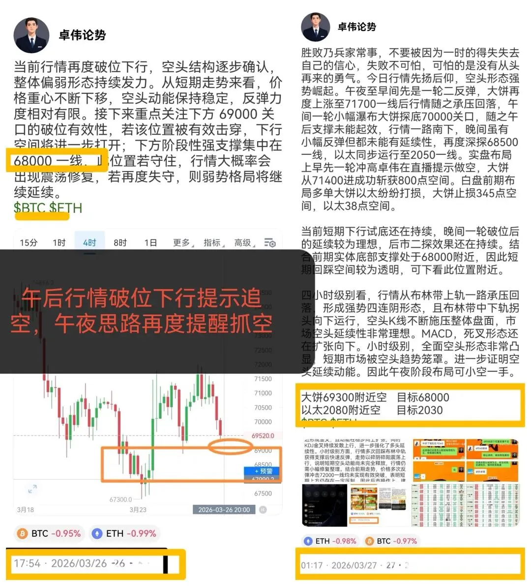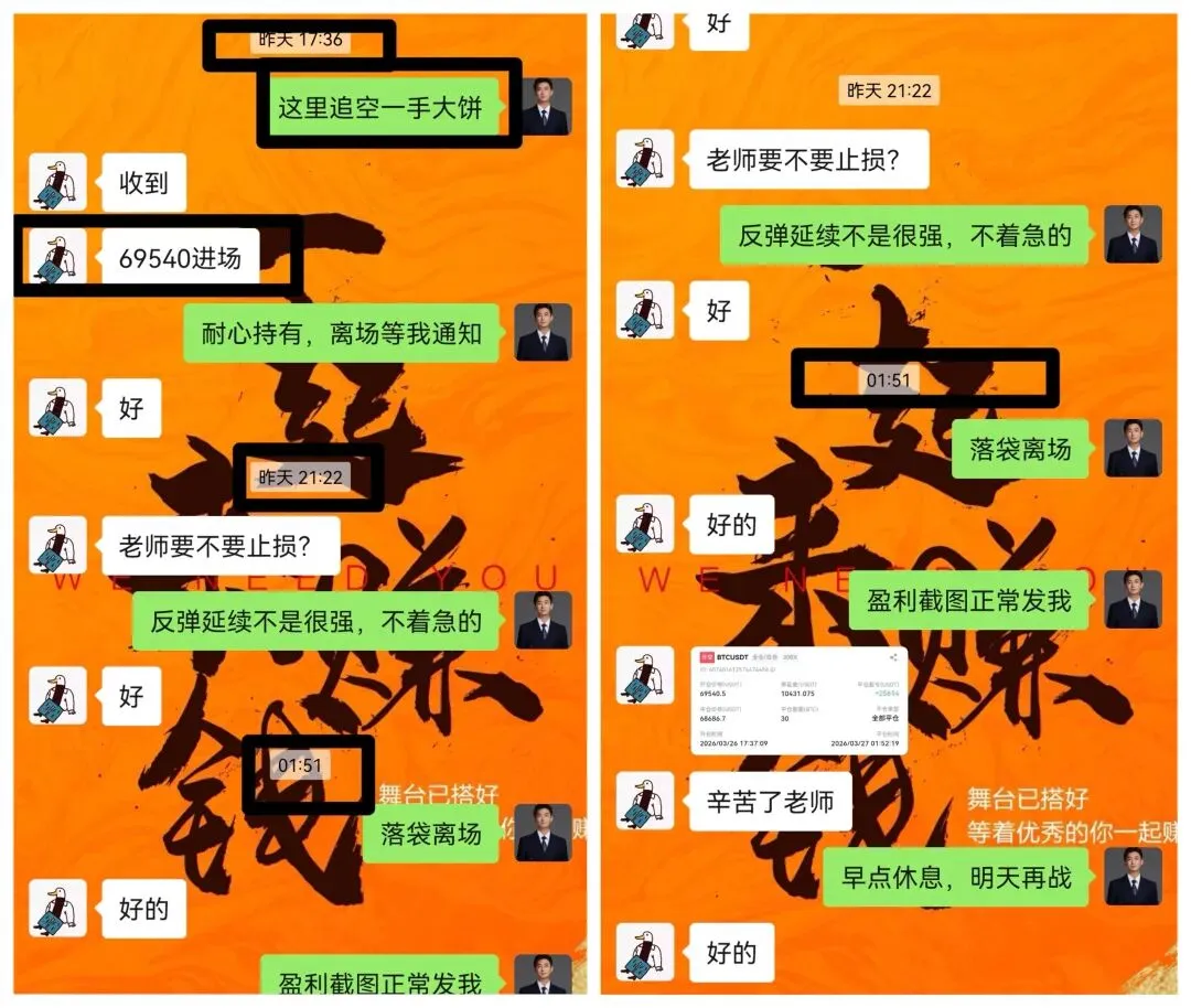 随后行情筑底运行,卓伟在直播间提示做多,大饼如期反弹到位69300一线,盘中也是同步跟进再度收网1000点空间。
