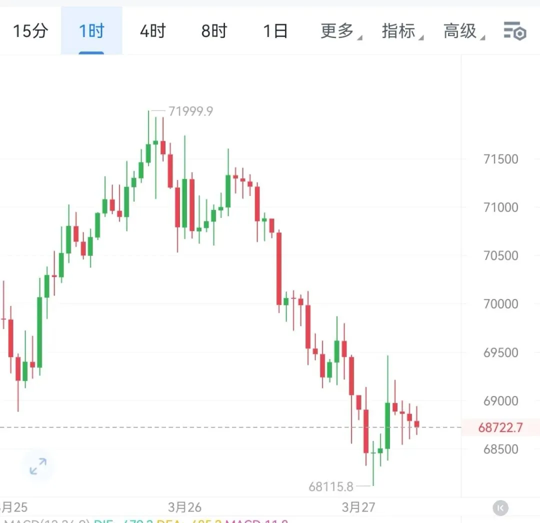 当前行情筑基运行,早间插针冲高后小幅回落修复。四小时级别看,币价从布林带下轨连阳上涨,前期空头K线小幅破位下轨后又被迅速收复,空头动能明显不足突破,行情转阳形态再度企稳。KDJ三轨拐头向上运行,形态稳步往金叉形态运行,证明市场逐步转阳,后市上涨情绪非常理想。小时级别行情修复回落,在布林带下盘区碎阴形态运行,明确突显空头动能的弱势形态。MACD底背离金叉形态已经形成,市场已经转阳,多头反弹效果非常理想。结合前期大饼探底68100一线后迅速反弹,进一步验证底部支撑效果,后市反弹效果非常理想。因此布局上顺势上看即可。